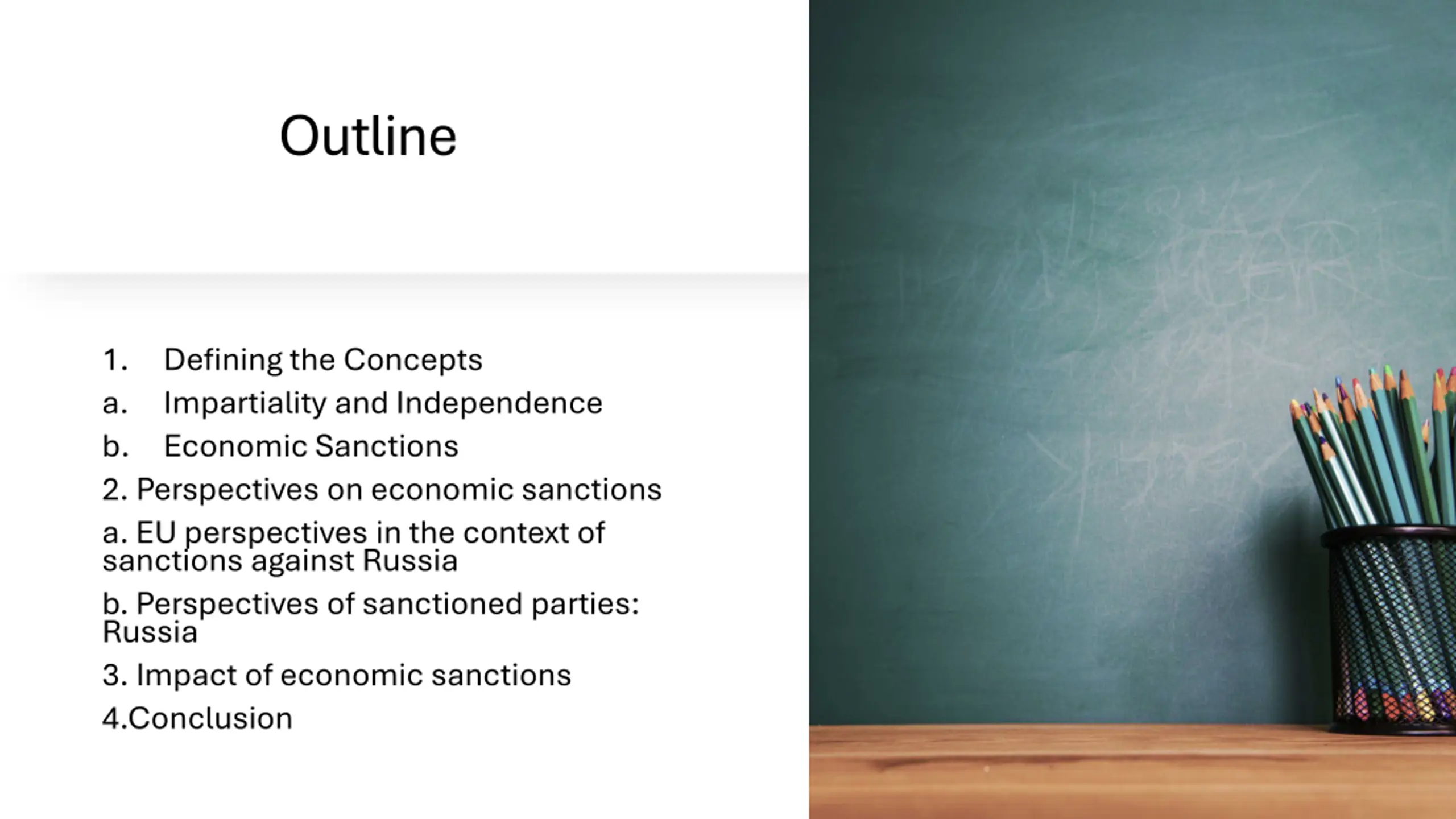 Outline 1. a. b. 2. Perspectives on economic sanctions a. EU perspectives in the context of sanctions against Russia b. Perspectives of sanctioned parties: Russia 3. Impact of economic sanctions 4.Conclusion Defining the Concepts Impartiality and Independence Economic Sanctions
