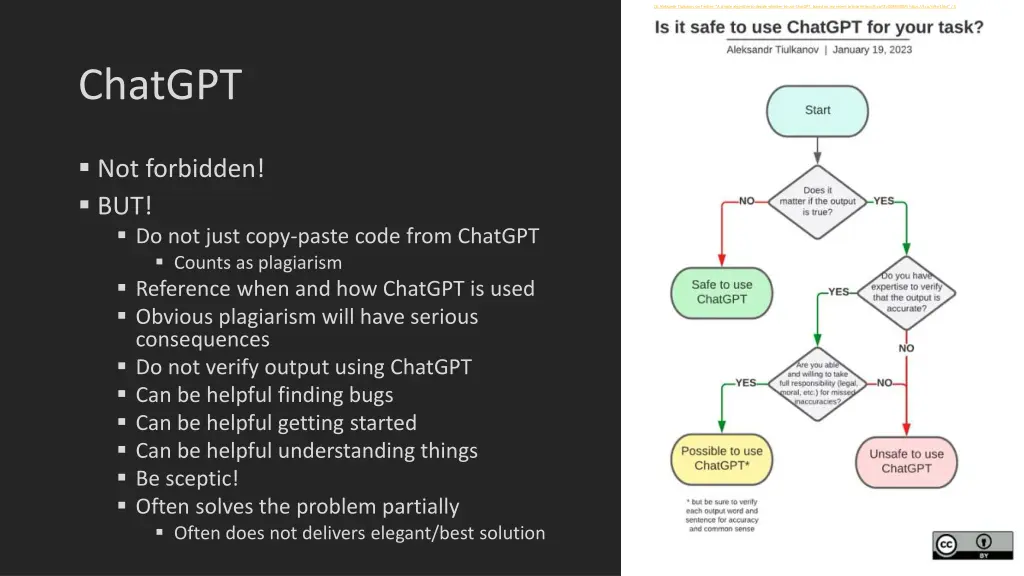 (1) Aleksandr Tiulkanov on Twitter: "A simple algorithm to decide whether to use ChatGPT, based on my recent article (https://t.co/tTzD0RAM0M) https://t.co/rs9vr1lAvI" / X 16 ChatGPT Not forbidden! BUT! Do not just copy-paste code from ChatGPT Counts as plagiarism Reference when and how ChatGPT is used Obvious plagiarism will have serious consequences Do not verify output using ChatGPT Can be helpful finding bugs Can be helpful getting started Can be helpful understanding things Be sceptic! Often solves the problem partially Often does not delivers elegant/best solution