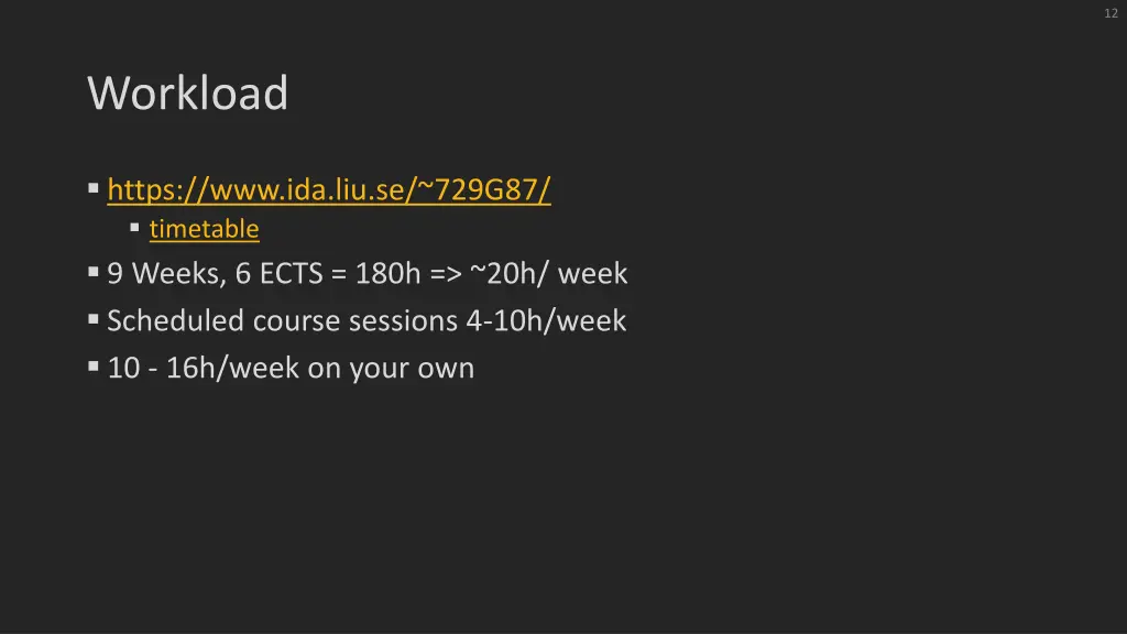 12 Workload https://www.ida.liu.se/~729G87/ timetable 9 Weeks, 6 ECTS = 180h => ~20h/ week Scheduled course sessions 4-10h/week 10 - 16h/week on your own