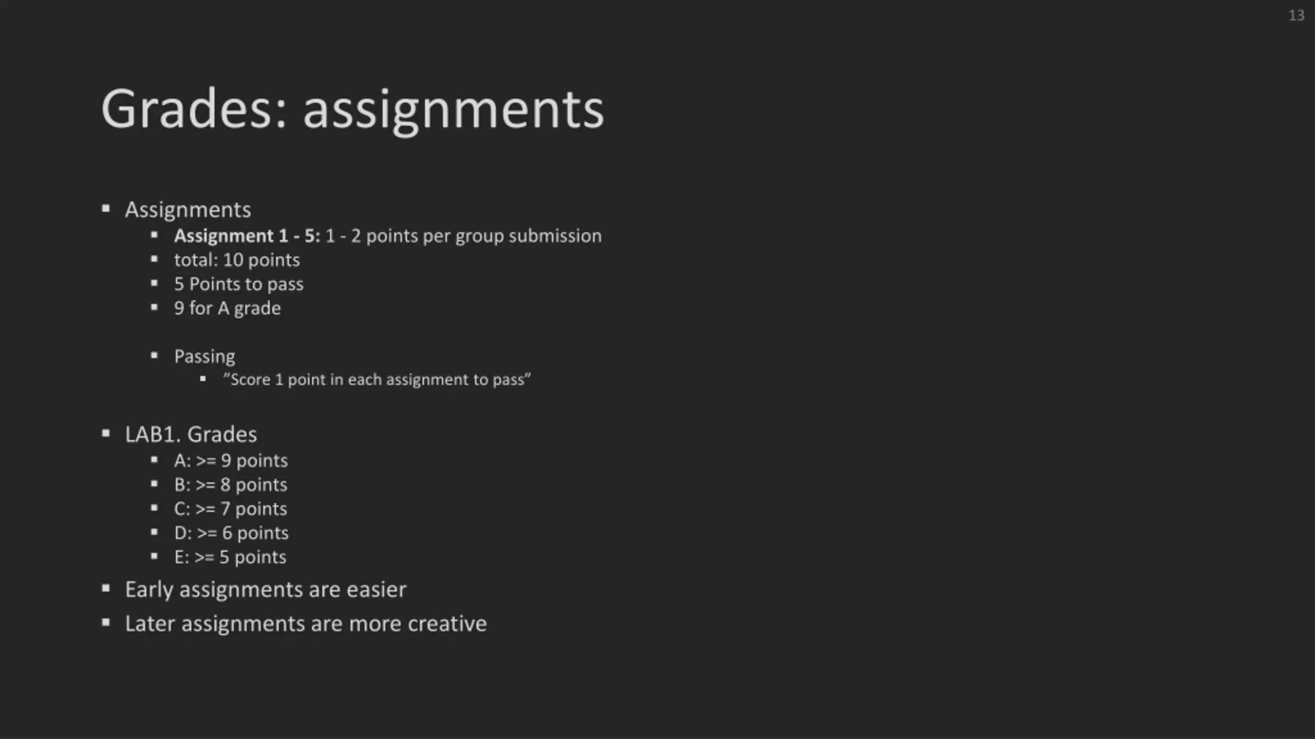 13 Grades: assignments Assignments Assignment 1 - 5: 1 - 2 points per group submission total: 10 points 5 Points to pass 9 for A grade Passing Score 1 point in each assignment to pass LAB1. Grades A: >= 9 points B: >= 8 points C: >= 7 points D: >= 6 points E: >= 5 points Early assignments are easier Later assignments are more creative