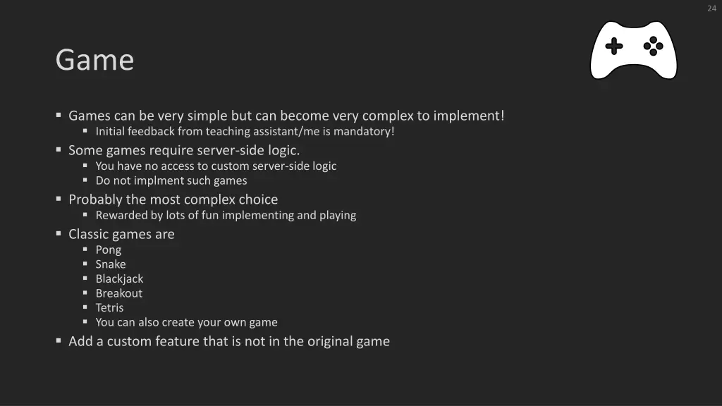 24 Game Games can be very simple but can become very complex to implement! Initial feedback from teaching assistant/me is mandatory! Some games require server-side logic. You have no access to custom server-side logic Do not implment such games Probably the most complex choice Rewarded by lots of fun implementing and playing Classic games are Pong Snake Blackjack Breakout Tetris You can also create your own game Add a custom feature that is not in the original game