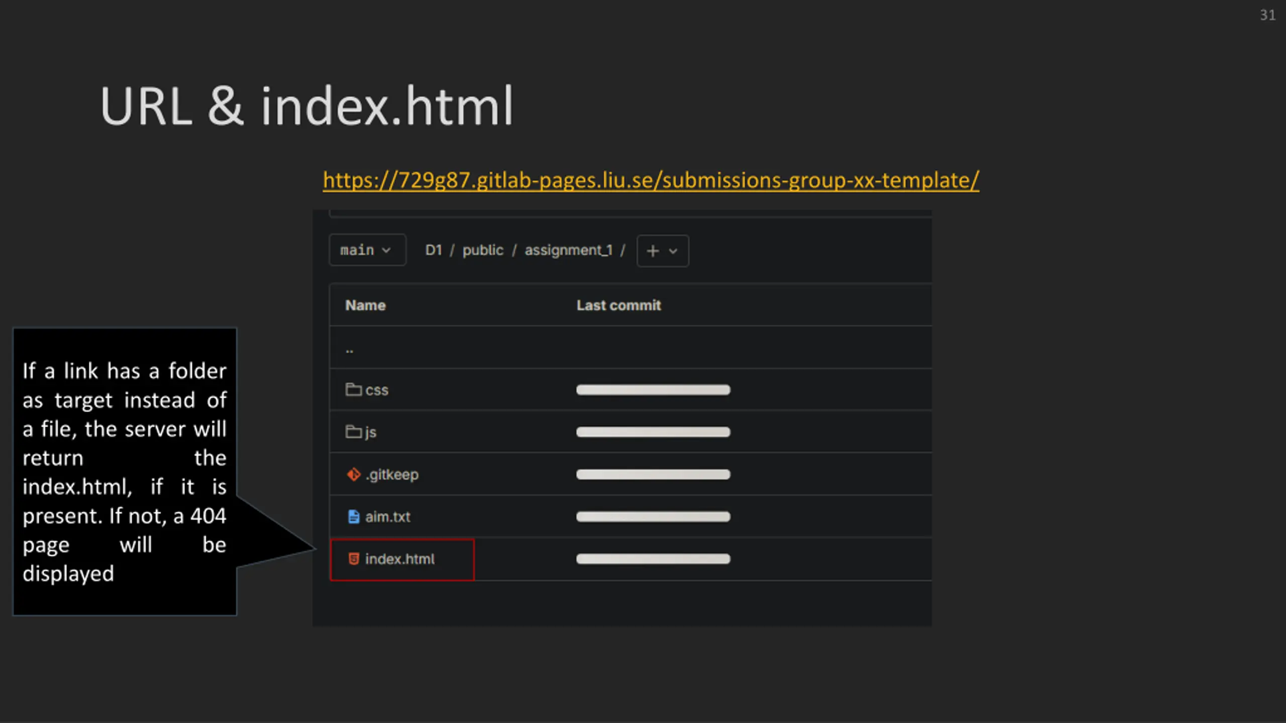 31 URL & index.html https://729g87.gitlab-pages.liu.se/submissions-group-xx-template/ If a link has a folder as target instead of a file, the server will return index.html, if it is present. If not, a 404 page will displayed the be
