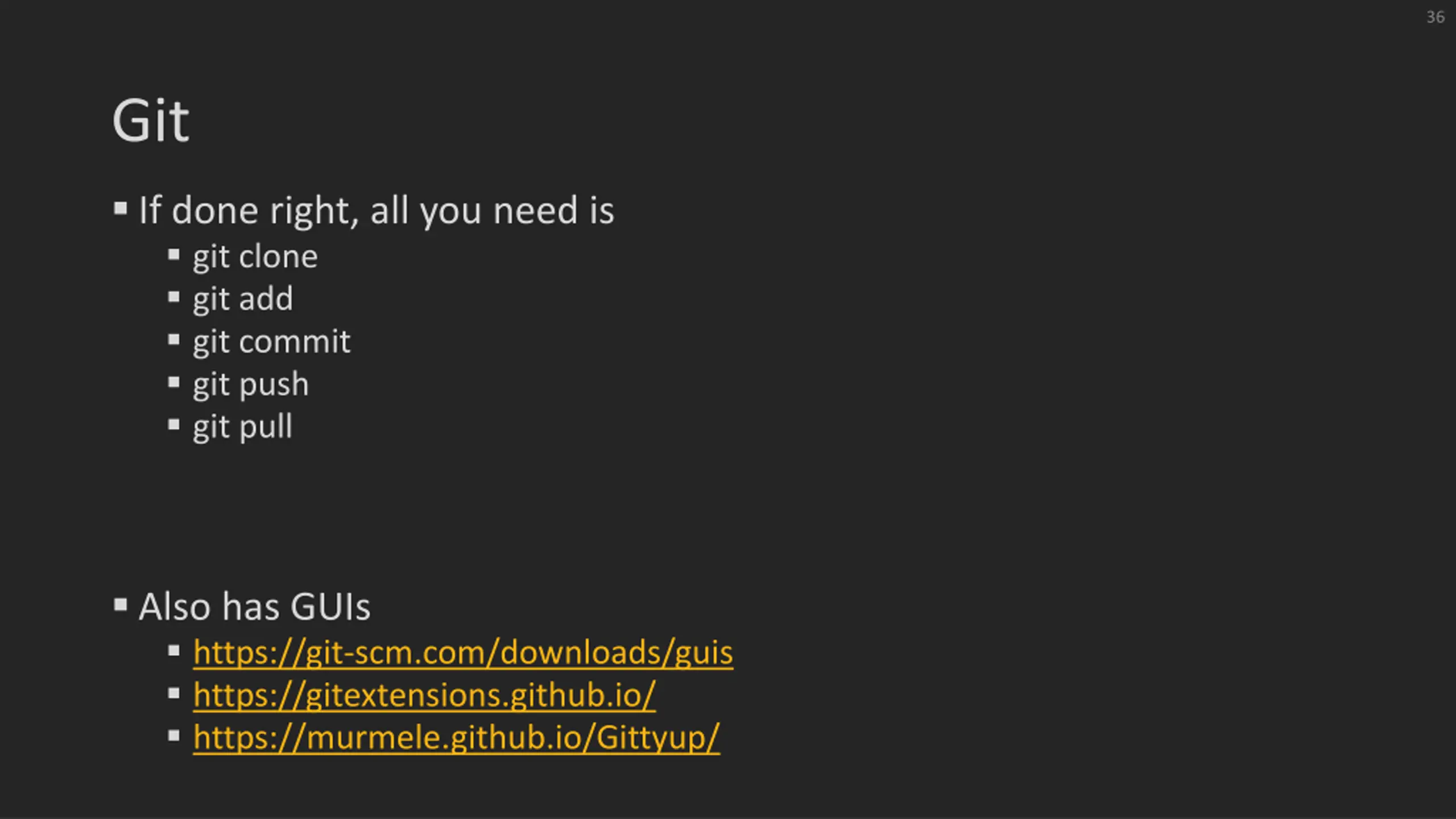 36 Git If done right, all you need is git clone git add git commit git push git pull Also has GUIs https://git-scm.com/downloads/guis https://gitextensions.github.io/ https://murmele.github.io/Gittyup/