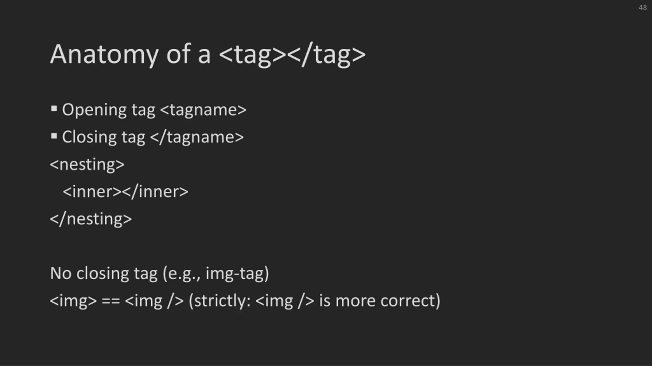 48 Anatomy of a <tag></tag> Opening tag <tagname> Closing tag </tagname> <nesting> <inner></inner> </nesting> No closing tag (e.g., img-tag) <img> == <img /> (strictly: <img /> is more correct)