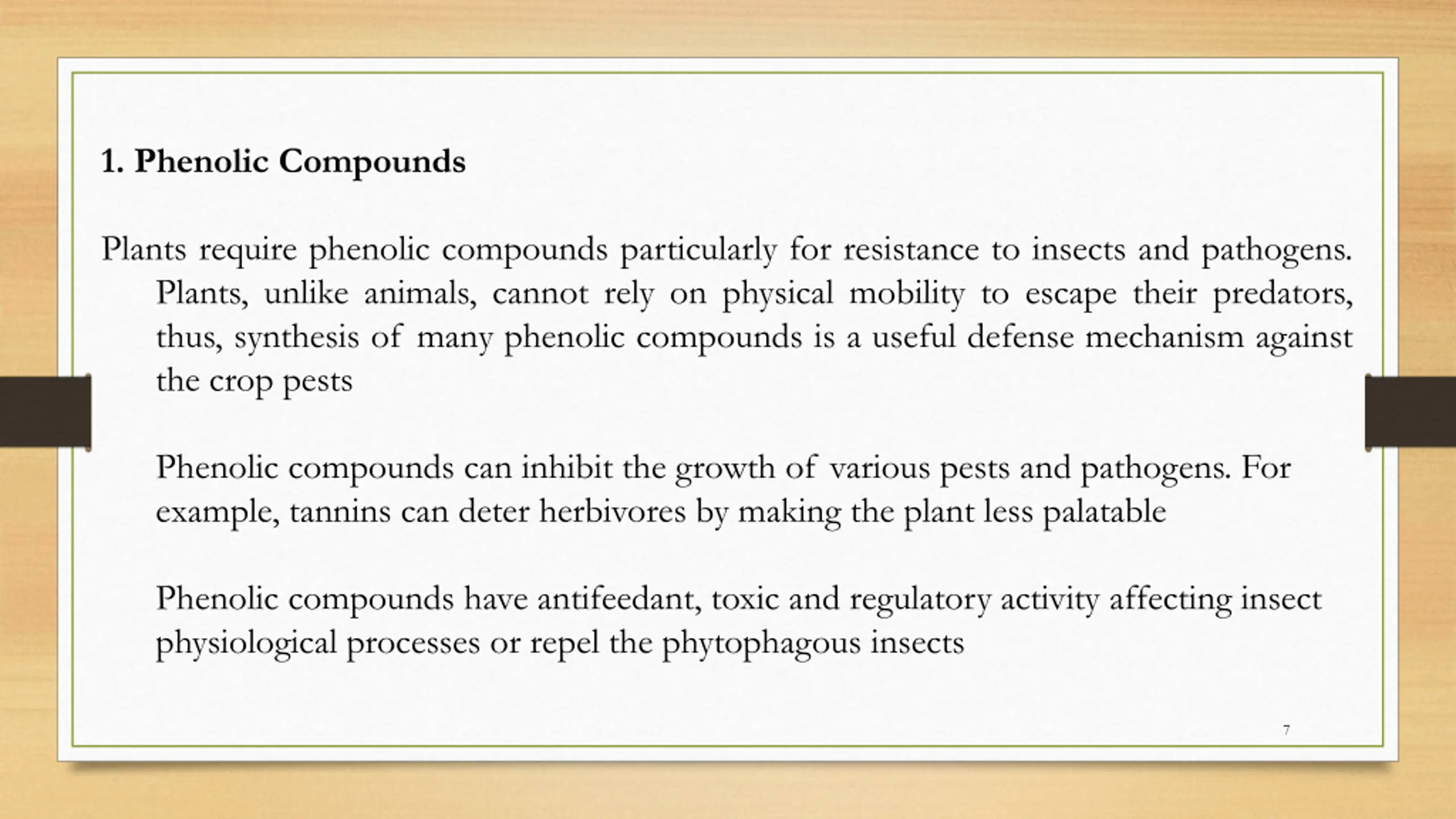1. Phenolic Compounds Plants require phenolic compounds particularly for resistance to insects and pathogens. Plants, unlike animals, cannot rely on physical mobility to escape their predators, thus, synthesis of many phenolic compounds is a useful defense mechanism against the crop pests Phenolic compounds can inhibit the growth of various pests and pathogens. For example, tannins can deter herbivores by making the plant less palatable Phenolic compounds have antifeedant, toxic and regulatory activity affecting insect physiological processes or repel the phytophagous insects 7