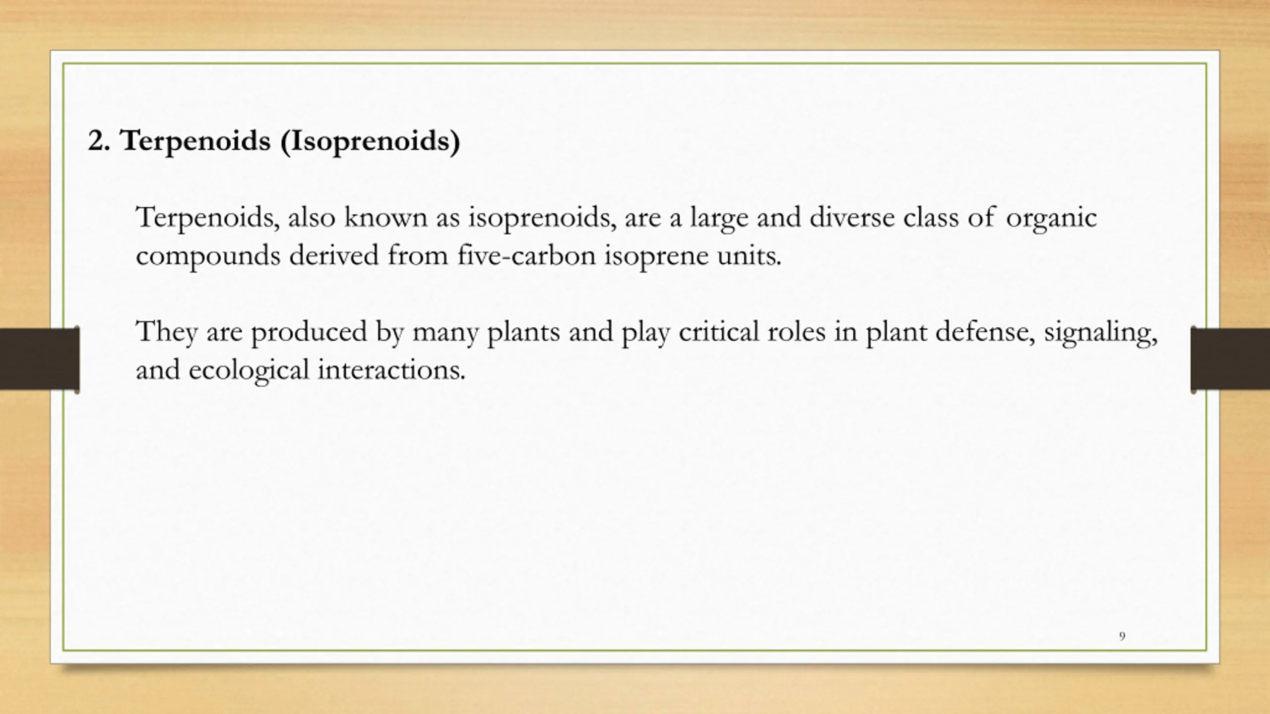 2. Terpenoids (Isoprenoids) Terpenoids, also known as isoprenoids, are a large and diverse class of organic compounds derived from five-carbon isoprene units. They are produced by many plants and play critical roles in plant defense, signaling, and ecological interactions. 9