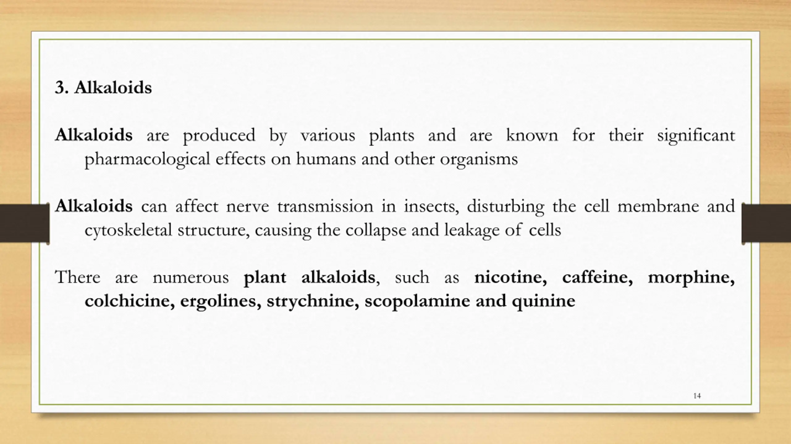 3. Alkaloids Alkaloids are produced by various plants and are known for their significant pharmacological effects on humans and other organisms Alkaloids can affect nerve transmission in insects, disturbing the cell membrane and cytoskeletal structure, causing the collapse and leakage of cells There are numerous plant alkaloids, such as nicotine, caffeine, morphine, colchicine, ergolines, strychnine, scopolamine and quinine 14