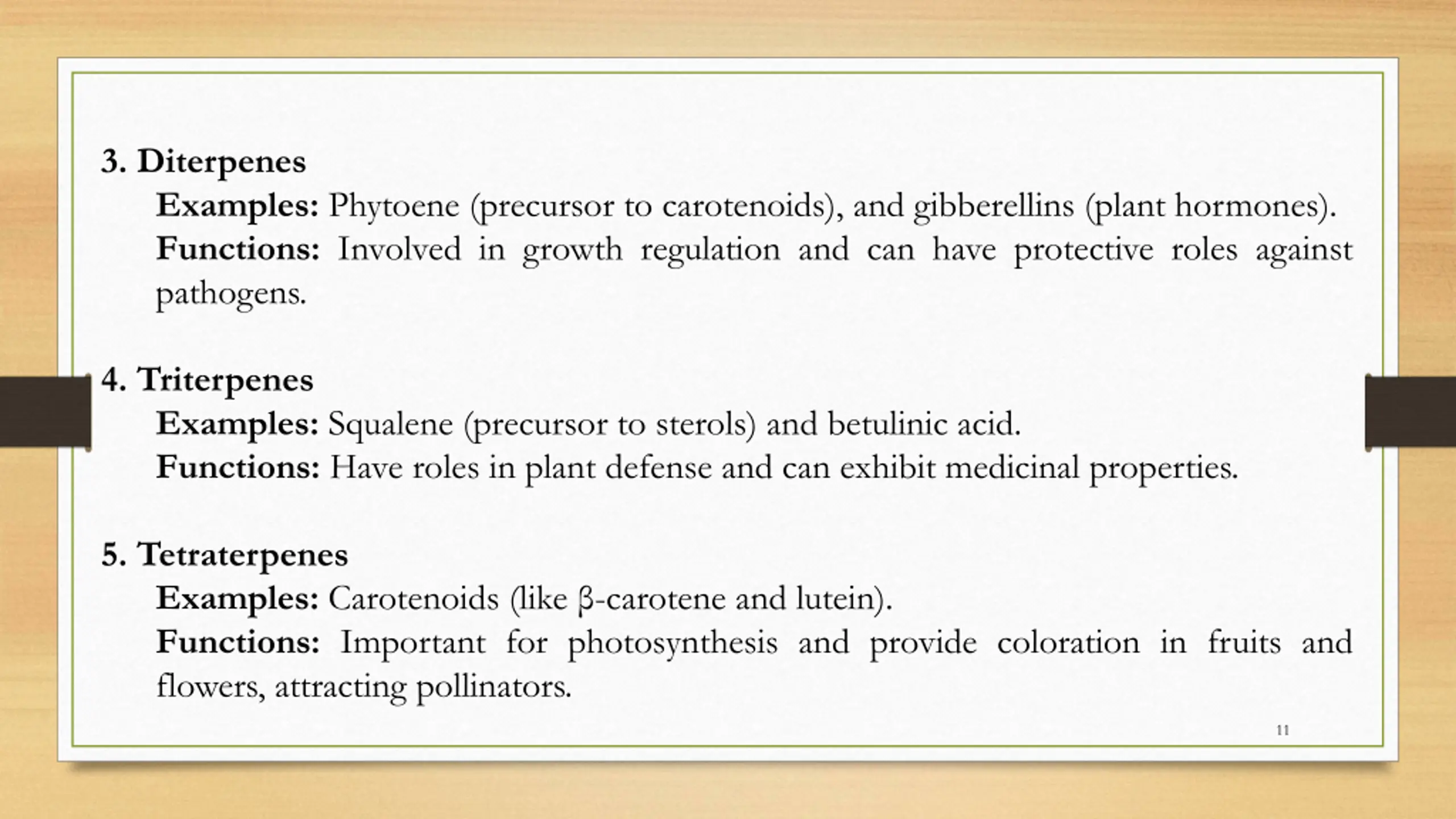 3. Diterpenes Examples: Phytoene (precursor to carotenoids), and gibberellins (plant hormones). Functions: Involved in growth regulation and can have protective roles against pathogens. 4. Triterpenes Examples: Squalene (precursor to sterols) and betulinic acid. Functions: Have roles in plant defense and can exhibit medicinal properties. 5. Tetraterpenes Examples: Carotenoids (like -carotene and lutein). Functions: Important for photosynthesis and provide coloration in fruits and flowers, attracting pollinators. 11