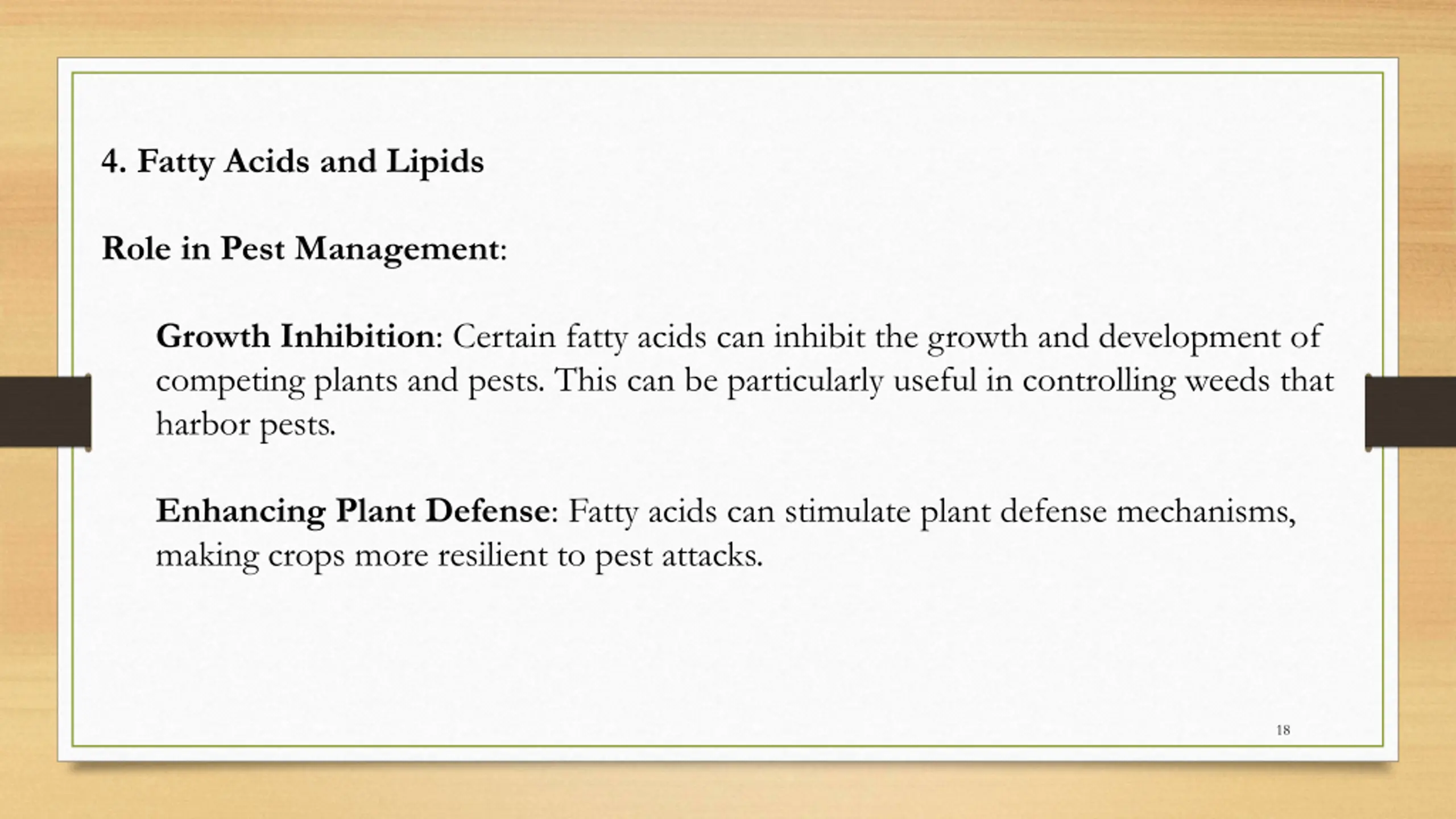 4. Fatty Acids and Lipids Role in Pest Management: Growth Inhibition: Certain fatty acids can inhibit the growth and development of competing plants and pests. This can be particularly useful in controlling weeds that harbor pests. Enhancing Plant Defense: Fatty acids can stimulate plant defense mechanisms, making crops more resilient to pest attacks. 18