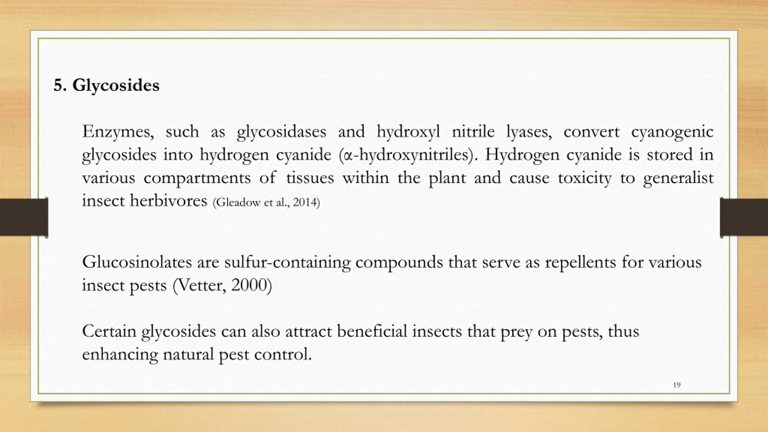 5. Glycosides Enzymes, such as glycosidases and hydroxyl nitrile lyases, convert cyanogenic glycosides into hydrogen cyanide ( -hydroxynitriles). Hydrogen cyanide is stored in various compartments of tissues within the plant and cause toxicity to generalist insect herbivores (Gleadow et al., 2014) Glucosinolates are sulfur-containing compounds that serve as repellents for various insect pests (Vetter, 2000) Certain glycosides can also attract beneficial insects that prey on pests, thus enhancing natural pest control. 19