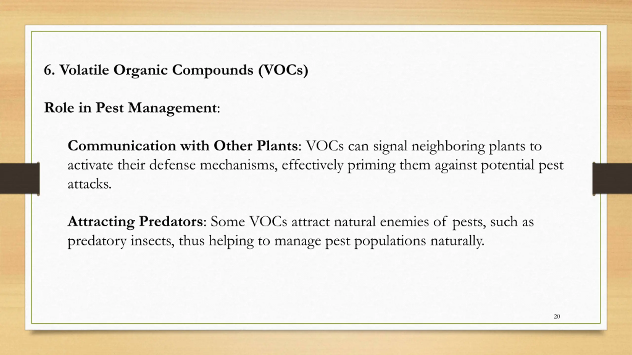 6. Volatile Organic Compounds (VOCs) Role in Pest Management: Communication with Other Plants: VOCs can signal neighboring plants to activate their defense mechanisms, effectively priming them against potential pest attacks. Attracting Predators: Some VOCs attract natural enemies of pests, such as predatory insects, thus helping to manage pest populations naturally. 20