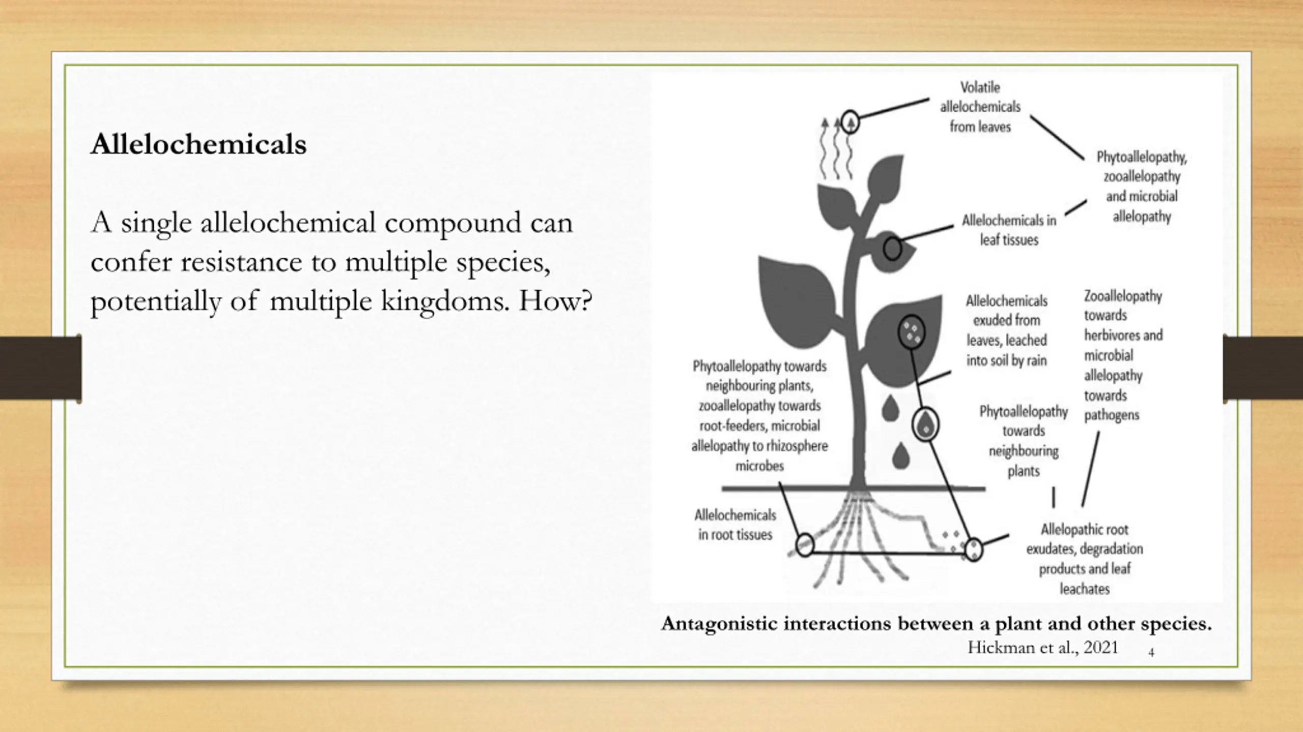 Allelochemicals A single allelochemical compound can confer resistance to multiple species, potentially of multiple kingdoms. How? Antagonistic interactions between a plant and other species. Hickman et al., 2021 4