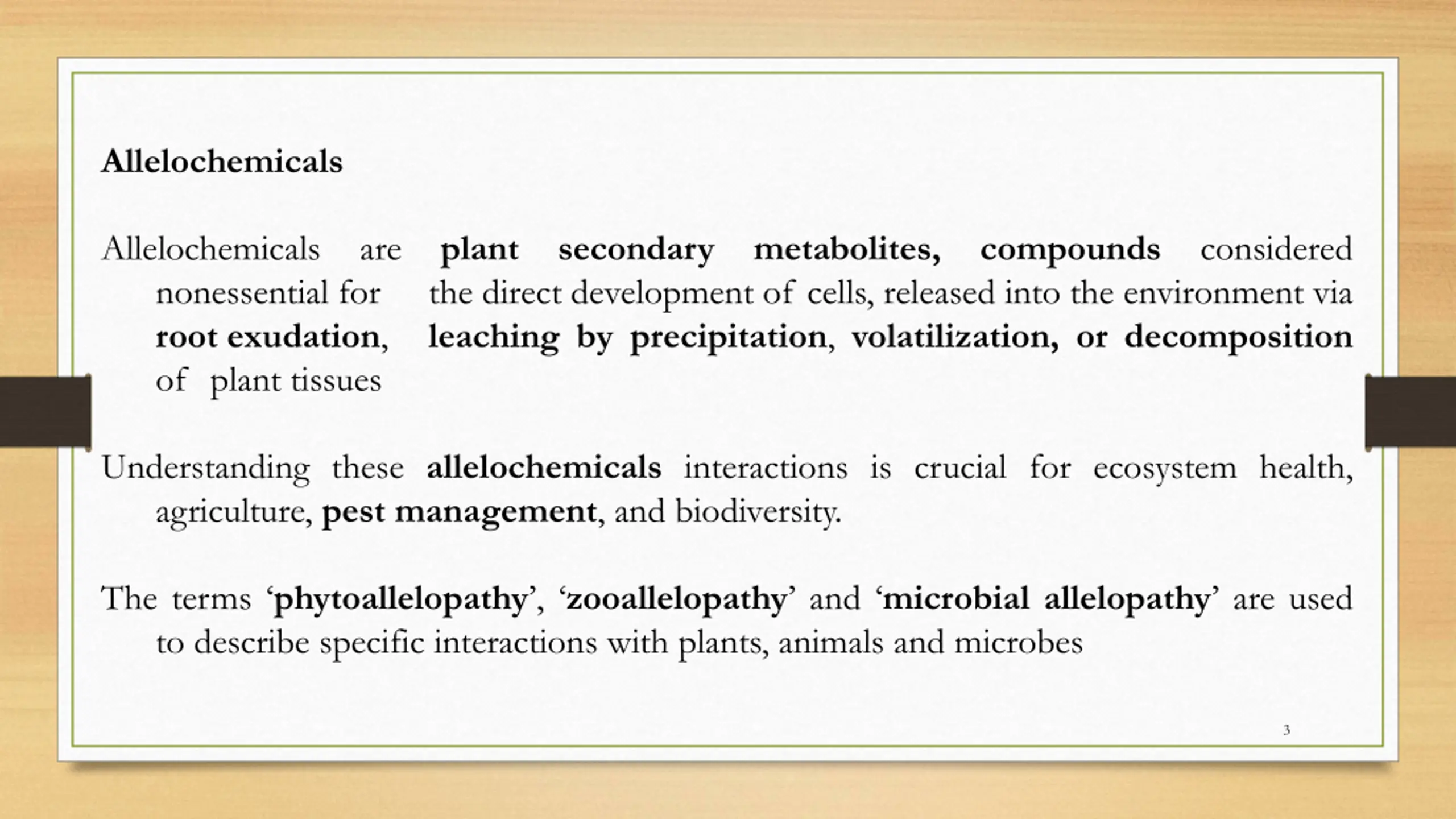 Allelochemicals Allelochemicals are plant secondary metabolites, compounds considered nonessential for the direct development of cells, released into the environment via root exudation, leaching by precipitation, volatilization, or decomposition of plant tissues Understanding these allelochemicals interactions is crucial for ecosystem health, agriculture, pest management, and biodiversity. The terms phytoallelopathy , zooallelopathy and microbial allelopathy are used to describe specific interactions with plants, animals and microbes 3