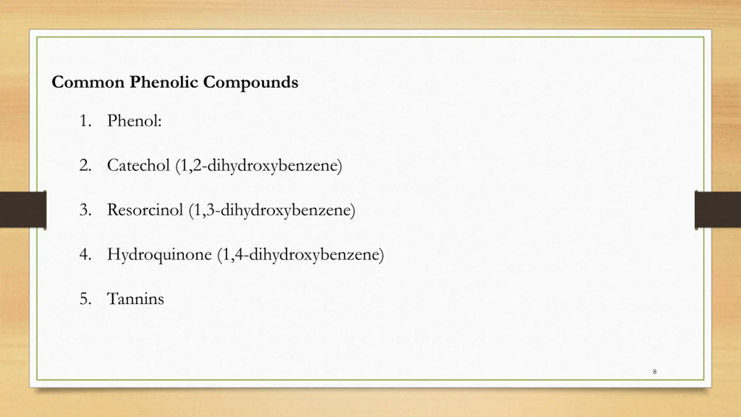 Common Phenolic Compounds 1. Phenol: 2. Catechol (1,2-dihydroxybenzene) 3. Resorcinol (1,3-dihydroxybenzene) 4. Hydroquinone (1,4-dihydroxybenzene) 5. Tannins 8