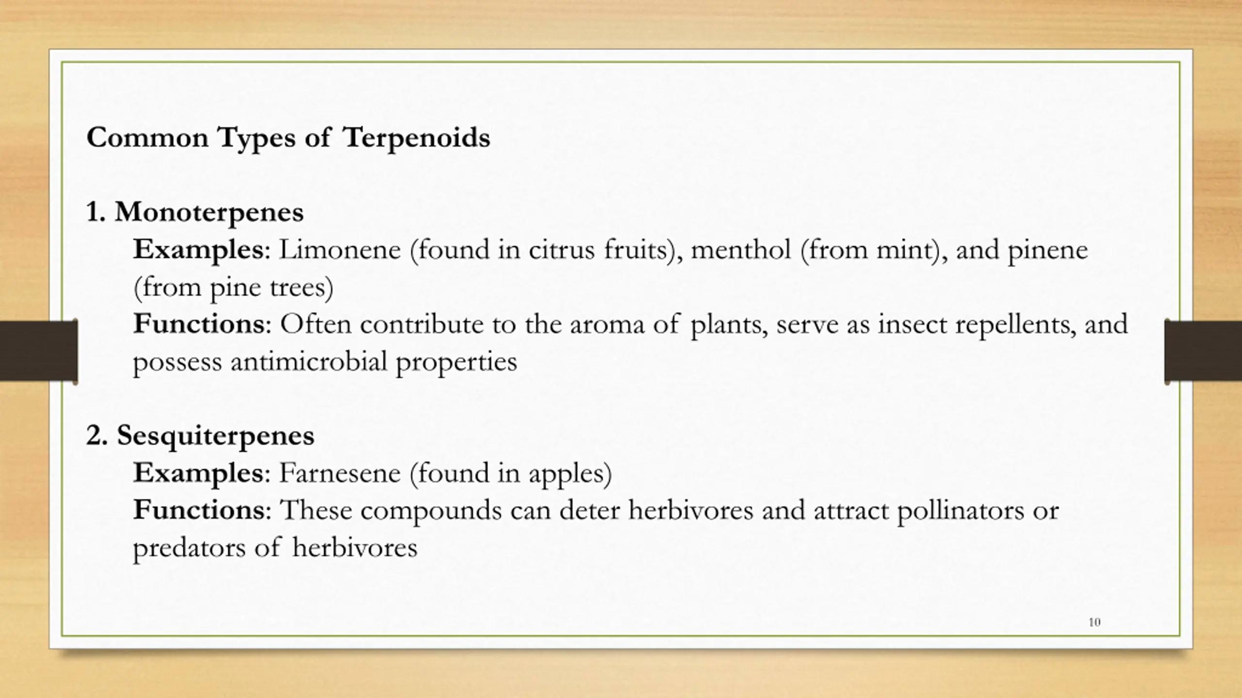 Common Types of Terpenoids 1. Monoterpenes Examples: Limonene (found in citrus fruits), menthol (from mint), and pinene (from pine trees) Functions: Often contribute to the aroma of plants, serve as insect repellents, and possess antimicrobial properties 2. Sesquiterpenes Examples: Farnesene (found in apples) Functions: These compounds can deter herbivores and attract pollinators or predators of herbivores 10