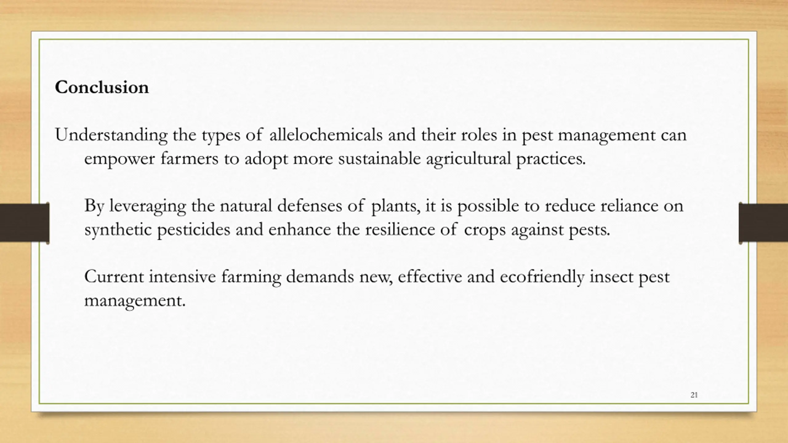 Conclusion Understanding the types of allelochemicals and their roles in pest management can empower farmers to adopt more sustainable agricultural practices. By leveraging the natural defenses of plants, it is possible to reduce reliance on synthetic pesticides and enhance the resilience of crops against pests. Current intensive farming demands new, effective and ecofriendly insect pest management. 21