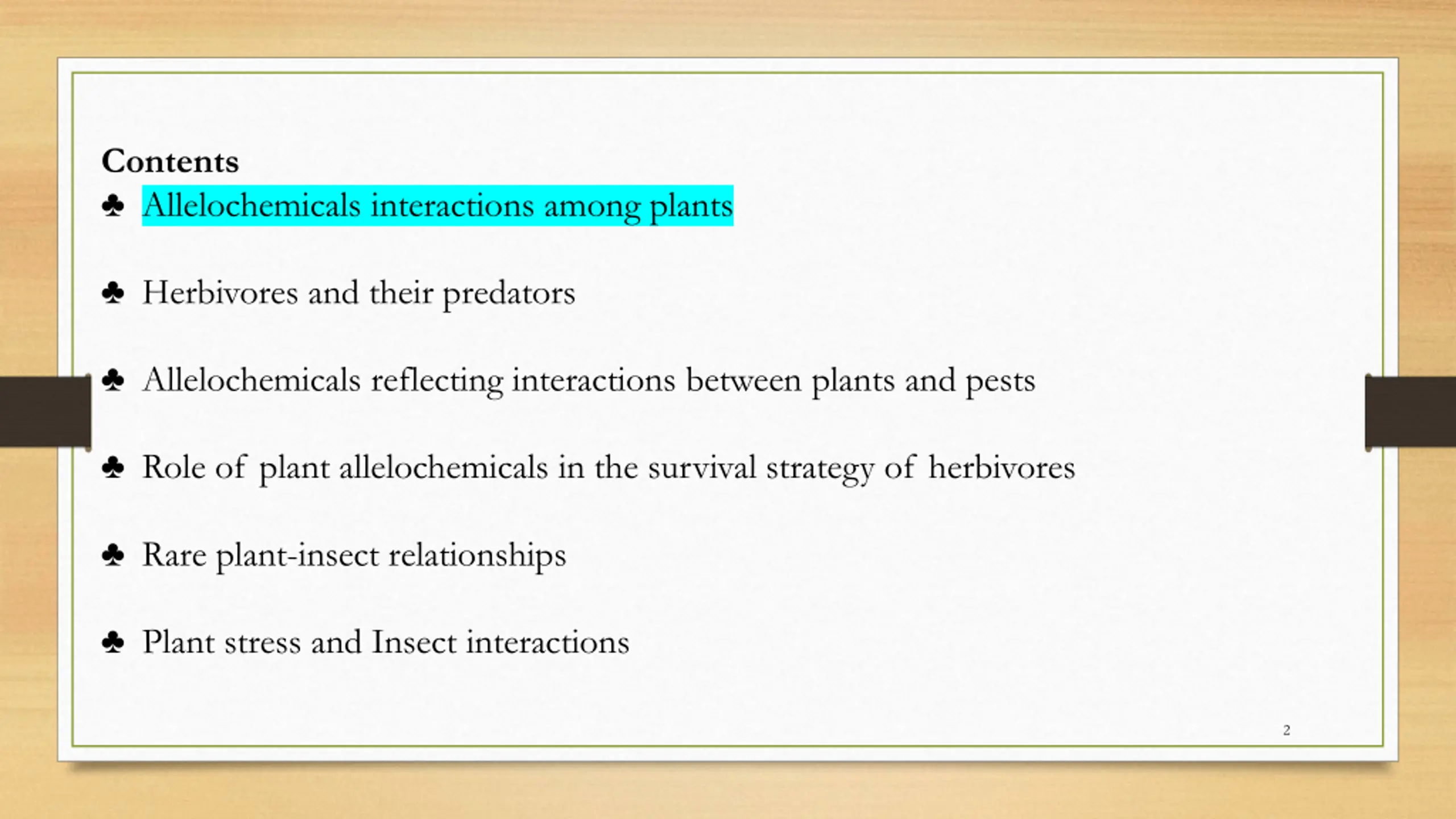 Contents Allelochemicals interactions among plants Herbivores and their predators Allelochemicals reflecting interactions between plants and pests Role of plant allelochemicals in the survival strategy of herbivores Rare plant-insect relationships Plant stress and Insect interactions 2