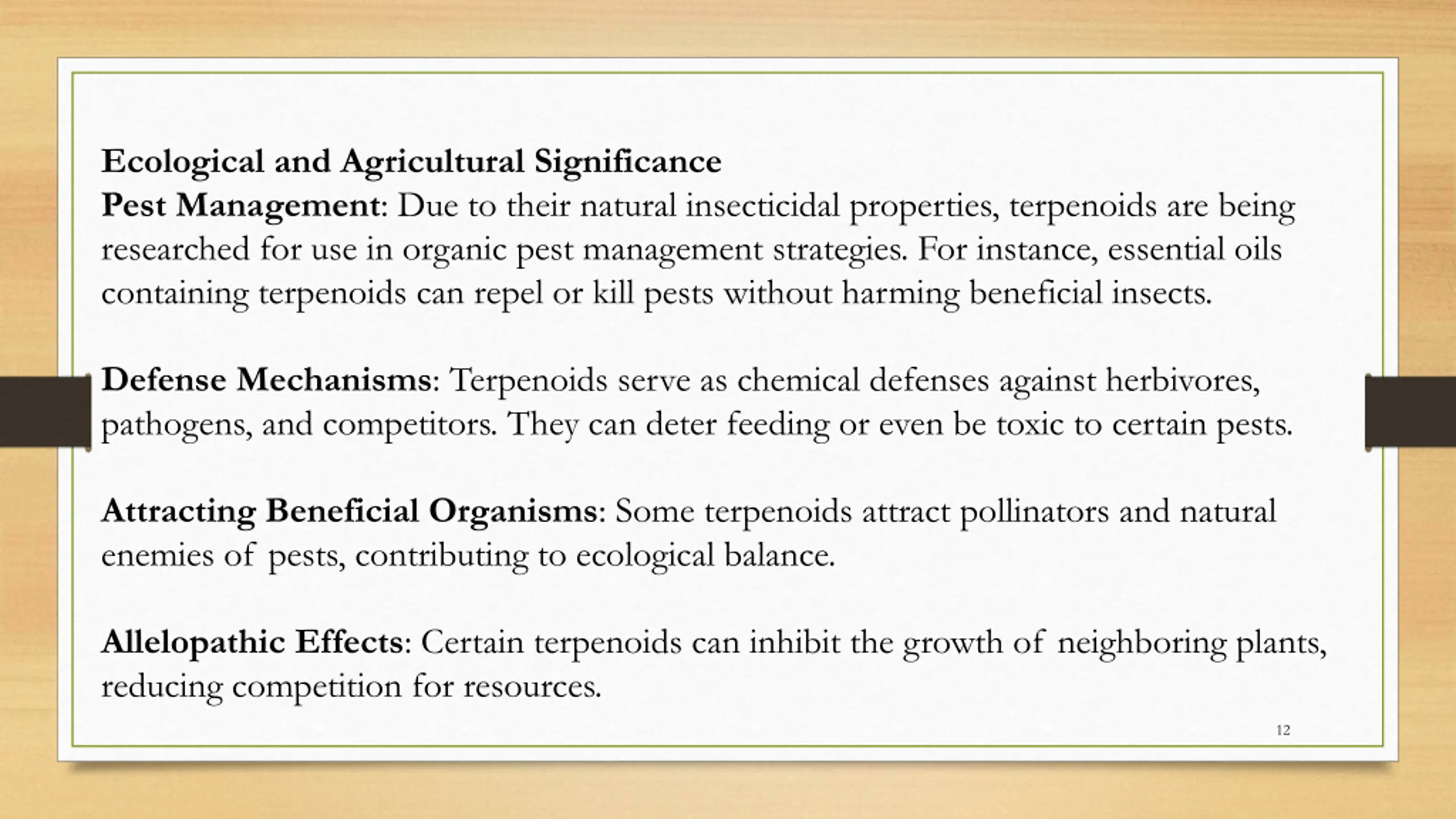 Ecological and Agricultural Significance Pest Management: Due to their natural insecticidal properties, terpenoids are being researched for use in organic pest management strategies. For instance, essential oils containing terpenoids can repel or kill pests without harming beneficial insects. Defense Mechanisms: Terpenoids serve as chemical defenses against herbivores, pathogens, and competitors. They can deter feeding or even be toxic to certain pests. Attracting Beneficial Organisms: Some terpenoids attract pollinators and natural enemies of pests, contributing to ecological balance. Allelopathic Effects: Certain terpenoids can inhibit the growth of neighboring plants, reducing competition for resources. 12