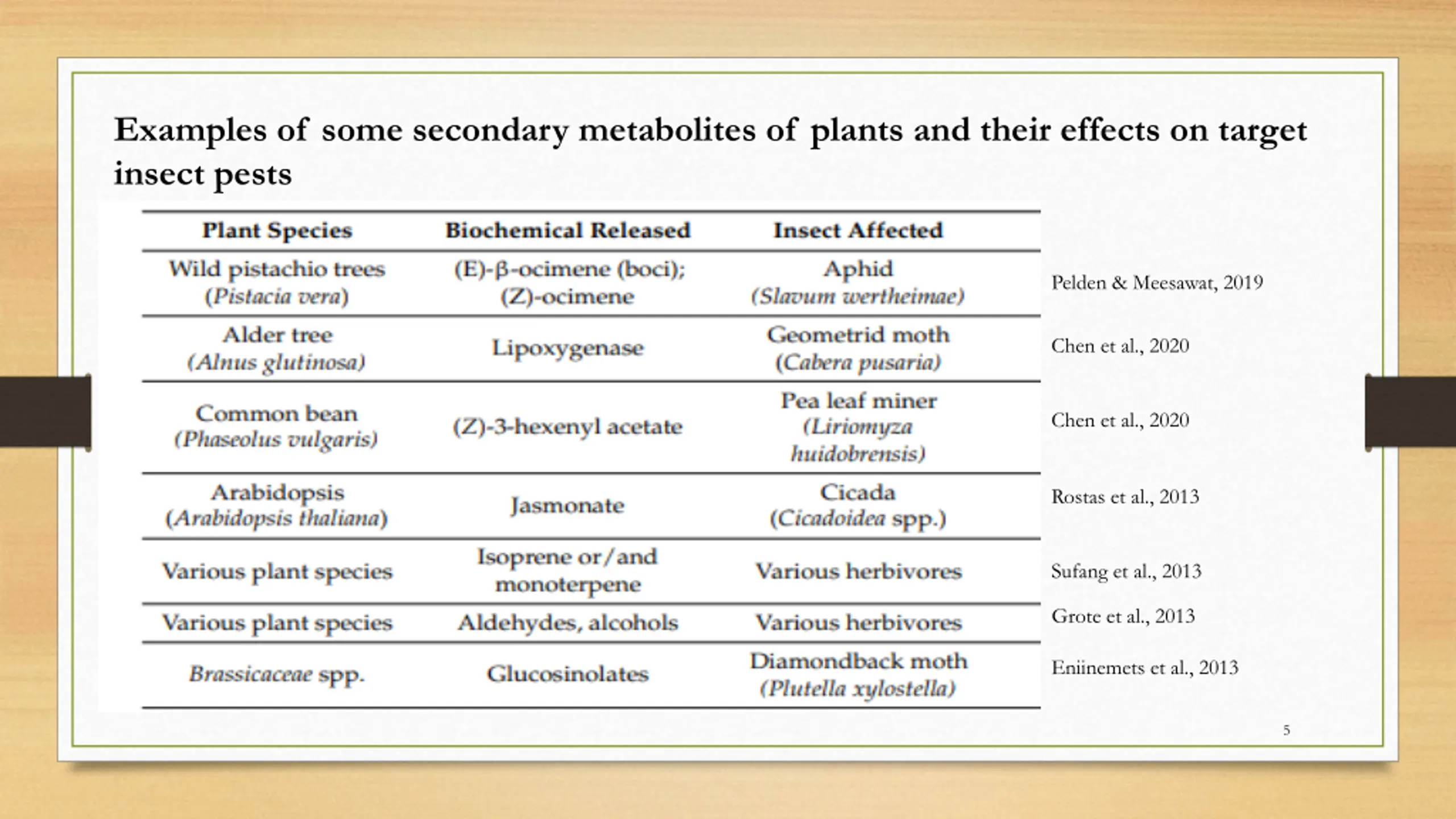 Examples of some secondary metabolites of plants and their effects on target insect pests Pelden & Meesawat, 2019 Chen et al., 2020 Chen et al., 2020 Rostas et al., 2013 Sufang et al., 2013 Grote et al., 2013 Eniinemets et al., 2013 5
