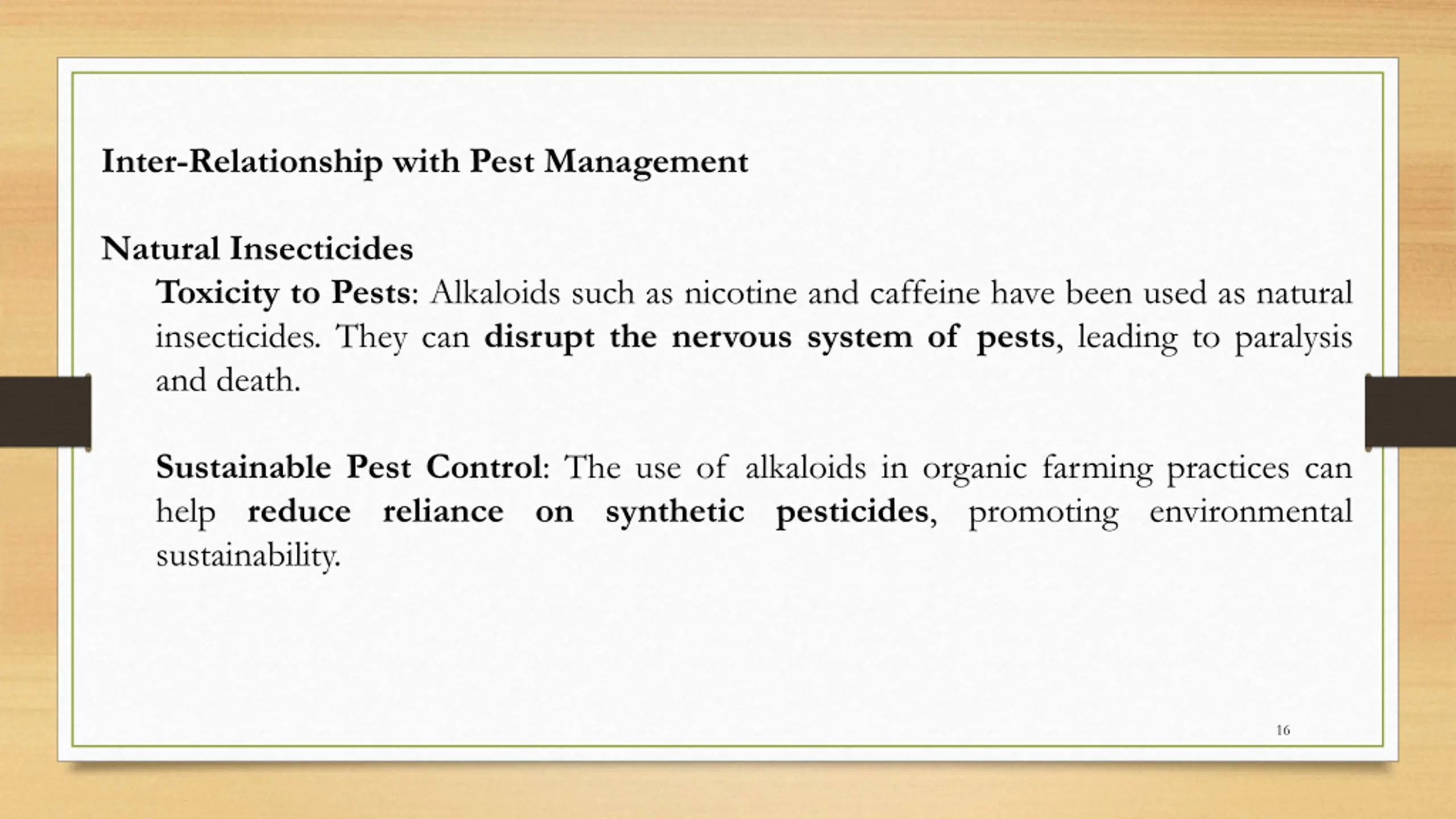 Inter-Relationship with Pest Management Natural Insecticides Toxicity to Pests: Alkaloids such as nicotine and caffeine have been used as natural insecticides. They can disrupt the nervous system of pests, leading to paralysis and death. Sustainable Pest Control: The use of alkaloids in organic farming practices can help reduce reliance on synthetic pesticides, promoting environmental sustainability. 16