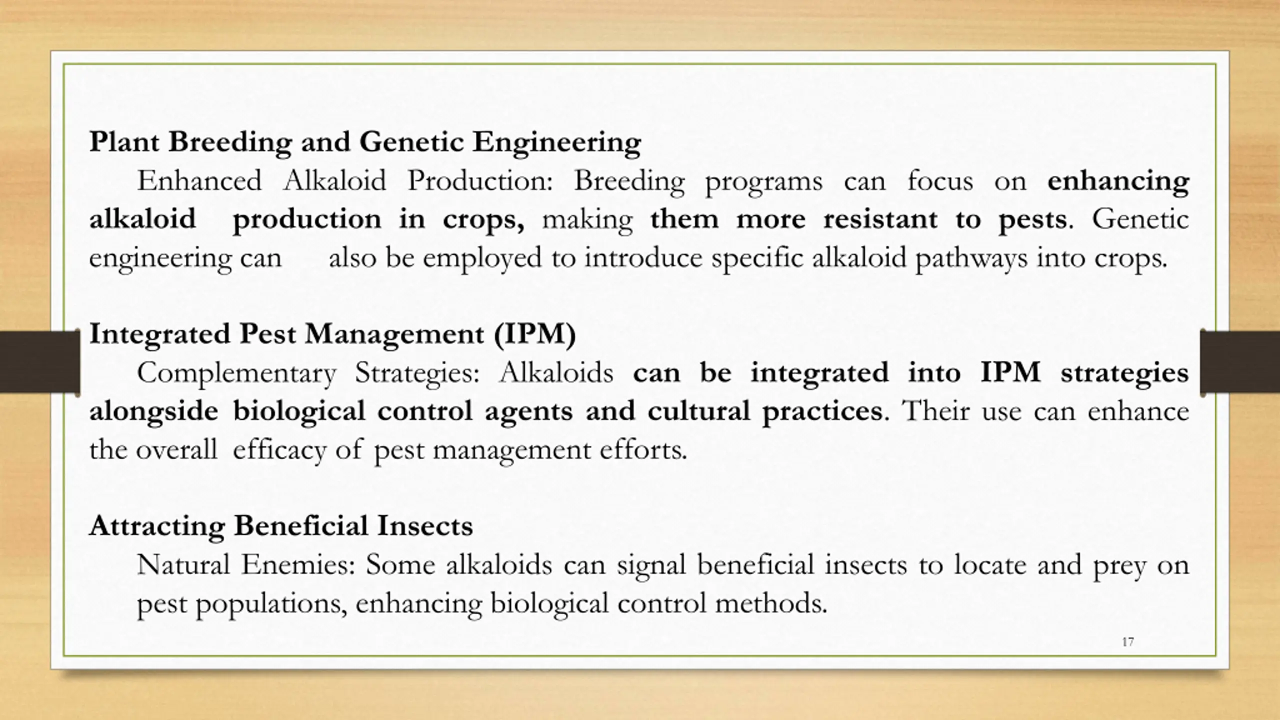 Plant Breeding and Genetic Engineering Enhanced Alkaloid Production:Breeding programs can focus on enhancing alkaloid production in crops, making them more resistant to pests. Genetic engineering can also be employed to introduce specific alkaloid pathways into crops. Integrated Pest Management (IPM) Complementary Strategies: Alkaloids can be integrated into IPM strategies alongside biological control agents and cultural practices. Their use can enhance the overall efficacy of pest management efforts. Attracting Beneficial Insects Natural Enemies: Some alkaloids can signal beneficial insects to locate and prey on pest populations, enhancing biological control methods. 17