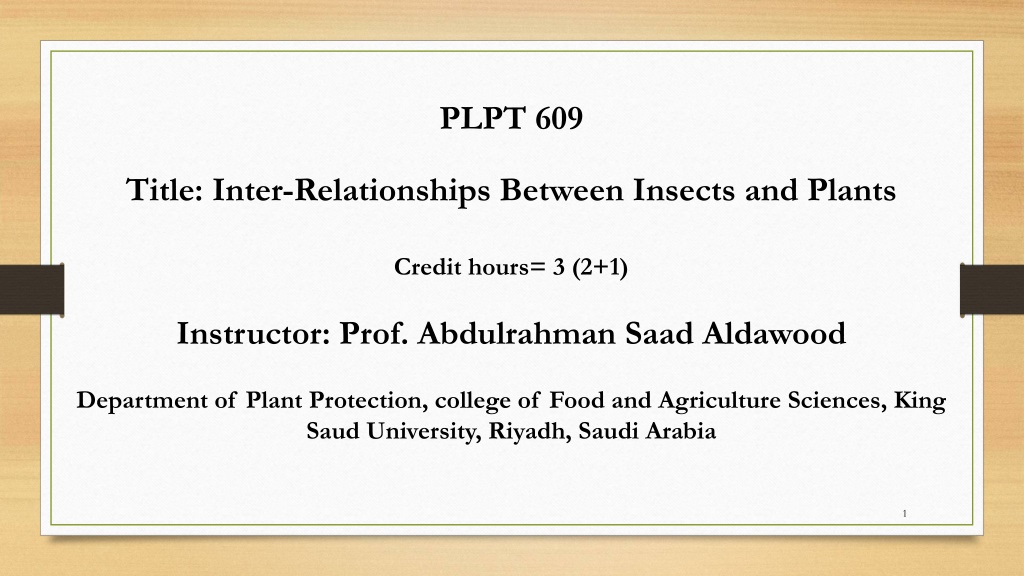 PLPT 609 Title: Inter-Relationships Between Insects and Plants Credit hours= 3 (2+1) Instructor: Prof. Abdulrahman Saad Aldawood Department of Plant Protection, college of Food and Agriculture Sciences, King Saud University, Riyadh, Saudi Arabia 1