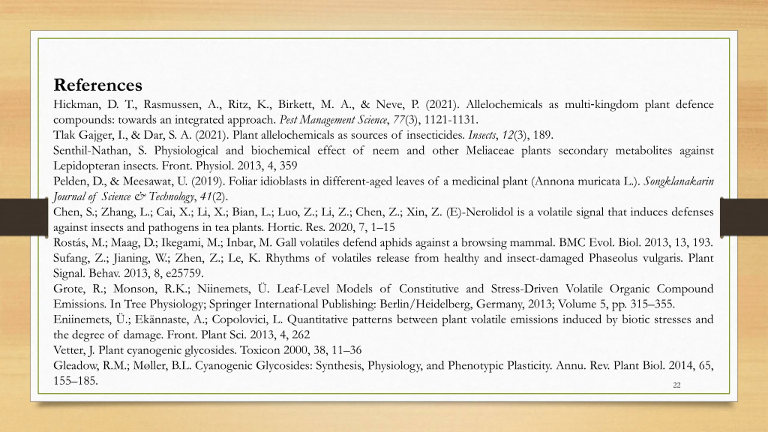 References Hickman, D. T., Rasmussen, A., Ritz, K., Birkett, M. A., & Neve, P. (2021). Allelochemicals as multi kingdom plant defence compounds: towards an integrated approach. Pest Management Science, 77(3), 1121-1131. Tlak Gajger, I., & Dar, S. A. (2021). Plant allelochemicals as sources of insecticides. Insects, 12(3), 189. Senthil-Nathan, S. Physiological and biochemical effect of neem and other Meliaceae plants secondary metabolites against Lepidopteran insects. Front. Physiol. 2013, 4, 359 Pelden, D., & Meesawat, U. (2019). Foliar idioblasts in different-aged leaves of a medicinal plant (Annona muricata L.). Songklanakarin Journal of Science & Technology, 41(2). Chen, S.; Zhang, L.; Cai, X.; Li, X.; Bian, L.; Luo, Z.; Li, Z.; Chen, Z.; Xin, Z. (E)-Nerolidol is a volatile signal that induces defenses against insects and pathogens in tea plants. Hortic. Res. 2020, 7, 1 15 Rost s, M.; Maag, D.; Ikegami, M.; Inbar, M. Gall volatiles defend aphids against a browsing mammal. BMC Evol. Biol. 2013, 13, 193. Sufang, Z.; Jianing, W.; Zhen, Z.; Le, K. Rhythms of volatiles release from healthy and insect-damaged Phaseolus vulgaris. Plant Signal. Behav. 2013, 8, e25759. Grote, R.; Monson, R.K.; Niinemets, . Leaf-Level Models of Constitutive and Stress-Driven Volatile Organic Compound Emissions. In Tree Physiology; Springer International Publishing: Berlin/Heidelberg, Germany, 2013; Volume 5, pp. 315 355. Eniinemets, .; Ek nnaste, A.; Copolovici, L. Quantitative patterns between plant volatile emissions induced by biotic stresses and the degree of damage. Front. Plant Sci. 2013, 4, 262 Vetter, J. Plant cyanogenic glycosides. Toxicon 2000, 38, 11 36 Gleadow, R.M.; M ller, B.L. Cyanogenic Glycosides: Synthesis, Physiology, and Phenotypic Plasticity. Annu. Rev. Plant Biol. 2014, 65, 155 185. 22