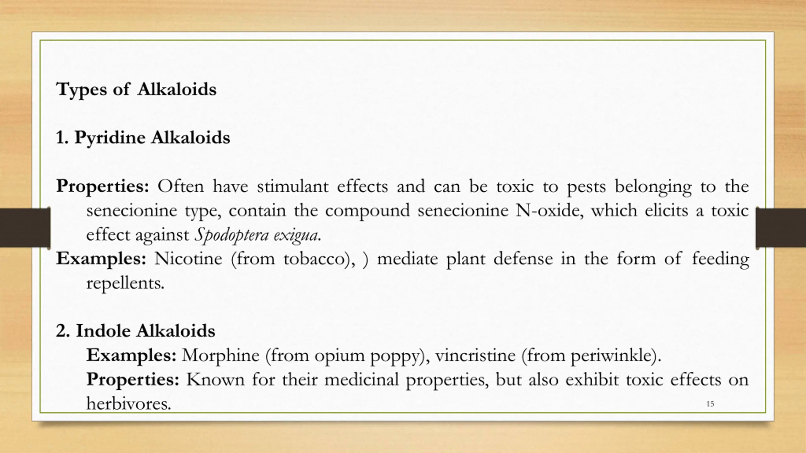 Types of Alkaloids 1. Pyridine Alkaloids Properties: Often have stimulant effects and can be toxic to pests belonging to the senecionine type, contain the compound senecionine N-oxide, which elicits a toxic effect against Spodoptera exigua. Examples: Nicotine (from tobacco), ) mediate plant defense in the form of feeding repellents. 2. Indole Alkaloids Examples: Morphine (from opium poppy), vincristine (from periwinkle). Properties: Known for their medicinal properties, but also exhibit toxic effects on herbivores. 15