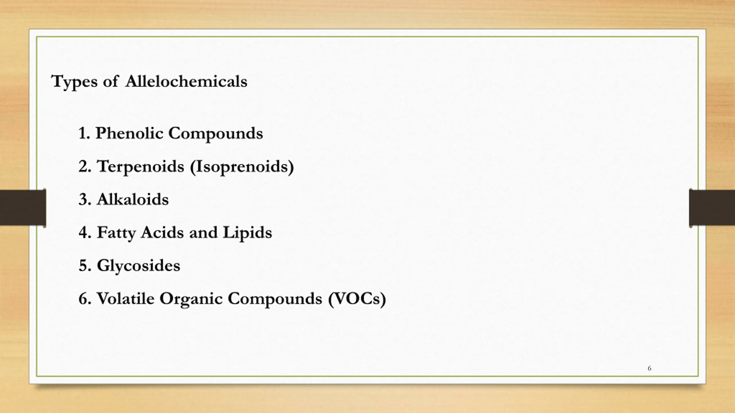 Types of Allelochemicals 1. Phenolic Compounds 2. Terpenoids (Isoprenoids) 3. Alkaloids 4. Fatty Acids and Lipids 5. Glycosides 6. Volatile Organic Compounds (VOCs) 6
