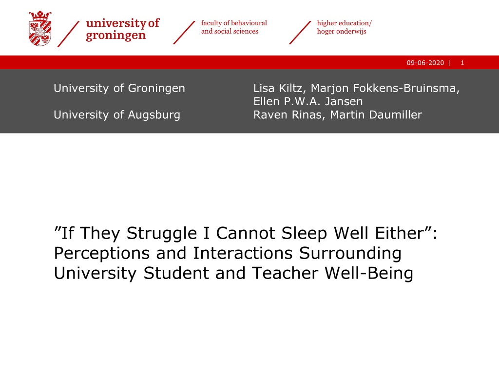 faculty of behavioural and social sciences and social sciences faculty of behavioural higher education/ hoger onderwijs hoger onderwijs higher education/ 09-06-2020 09-06-2020 | | 1 1 University of Groningen Lisa Kiltz, Marjon Fokkens-Bruinsma, Ellen P.W.A. Jansen Raven Rinas, Martin Daumiller University of Augsburg If They Struggle I Cannot Sleep Well Either : Perceptions and Interactions Surrounding University Student and Teacher Well-Being