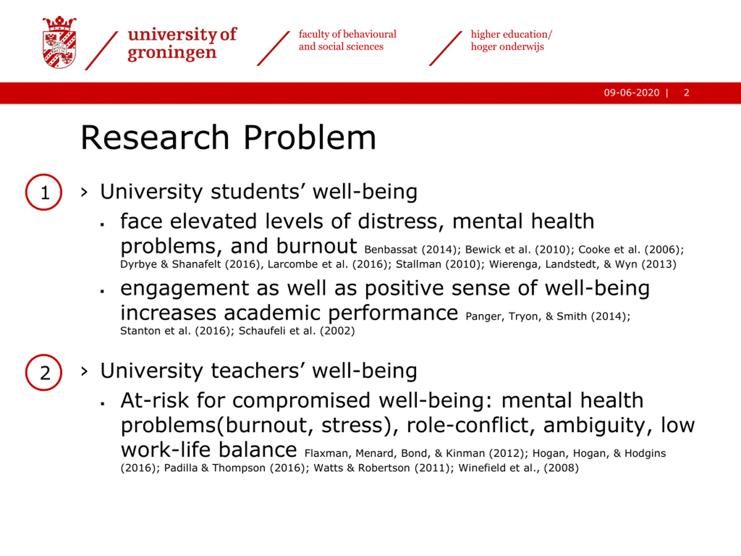 faculty of behavioural and social sciences higher education/ hoger onderwijs 09-06-2020 | 2 Research Problem University students well-being face elevated levels of distress, mental health problems, and burnout Benbassat (2014); Bewick et al. (2010); Cooke et al. (2006); Dyrbye & Shanafelt (2016), Larcombe et al. (2016); Stallman (2010); Wierenga, Landstedt, & Wyn (2013) engagement as well as positive sense of well-being increases academic performance Panger, Tryon, & Smith (2014); Stanton et al. (2016); Schaufeli et al. (2002) 1 University teachers well-being At-risk for compromised well-being: mental health problems(burnout, stress), role-conflict, ambiguity, low work-life balance Flaxman, Menard, Bond, & Kinman (2012); Hogan, Hogan, & Hodgins (2016); Padilla & Thompson (2016); Watts & Robertson (2011); Winefield et al., (2008) 2
