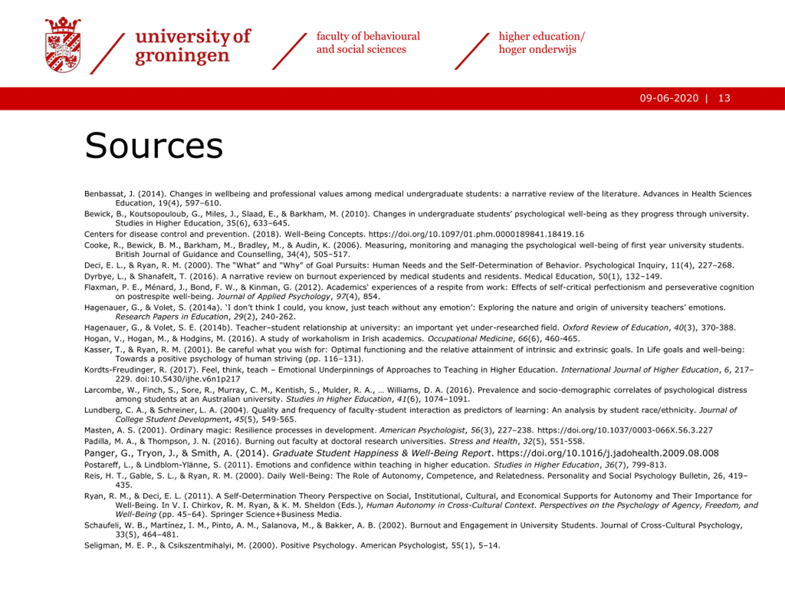faculty of behavioural and social sciences higher education/ hoger onderwijs 09-06-2020 | 13 Sources Benbassat, J. (2014). Changes in wellbeing and professional values among medical undergraduate students: a narrative review of the literature. Advances in Health Sciences Education, 19(4), 597 610. Bewick, B., Koutsopouloub, G., Miles, J., Slaad, E., & Barkham, M. (2010). Changes in undergraduate students psychological well-being as they progress through university. Studies in Higher Education, 35(6), 633 645. Centers for disease control and prevention. (2018). Well-Being Concepts. https://doi.org/10.1097/01.phm.0000189841.18419.16 Cooke, R., Bewick, B. M., Barkham, M., Bradley, M., & Audin, K. (2006). Measuring, monitoring and managing the psychological well-being of first year university students. British Journal of Guidance and Counselling, 34(4), 505 517. Deci, E. L., & Ryan, R. M. (2000). The What and "Why" of Goal Pursuits: Human Needs and the Self-Determination of Behavior. Psychological Inquiry, 11(4), 227 268. Dyrbye, L., & Shanafelt, T. (2016). A narrative review on burnout experienced by medical students and residents. Medical Education, 50(1), 132 149. Flaxman, P. E., M nard, J., Bond, F. W., & Kinman, G. (2012). Academics' experiences of a respite from work: Effects of self-critical perfectionism and perseverative cognition on postrespite well-being. Journal of Applied Psychology, 97(4), 854. Hagenauer, G., & Volet, S. (2014a). I don t think I could, you know, just teach without any emotion : Exploring the nature and origin of university teachers emotions. Research Papers in Education, 29(2), 240-262. Hagenauer, G., & Volet, S. E. (2014b). Teacher student relationship at university: an important yet under-researched field. Oxford Review of Education, 40(3), 370-388. Hogan, V., Hogan, M., & Hodgins, M. (2016). A study of workaholism in Irish academics. Occupational Medicine, 66(6), 460-465. Kasser, T., & Ryan, R. M. (2001). Be careful what you wish for: Optimal functioning and the relative attainment of intrinsic and extrinsic goals. In Life goals and well-being: Towards a positive psychology of human striving (pp. 116 131). Kordts-Freudinger, R. (2017). Feel, think, teach Emotional Underpinnings of Approaches to Teaching in Higher Education. International Journal of Higher Education, 6, 217 229. doi:10.5430/ijhe.v6n1p217 Larcombe, W., Finch, S., Sore, R., Murray, C. M., Kentish, S., Mulder, R. A., Williams, D. A. (2016). Prevalence and socio-demographic correlates of psychological distress among students at an Australian university. Studies in Higher Education, 41(6), 1074 1091. Lundberg, C. A., & Schreiner, L. A. (2004). Quality and frequency of faculty-student interaction as predictors of learning: An analysis by student race/ethnicity. Journal of College Student Development, 45(5), 549-565. Masten, A. S. (2001). Ordinary magic: Resilience processes in development. American Psychologist, 56(3), 227 238. https://doi.org/10.1037/0003-066X.56.3.227 Padilla, M. A., & Thompson, J. N. (2016). Burning out faculty at doctoral research universities. Stress and Health, 32(5), 551-558. Panger, G., Tryon, J., & Smith, A. (2014). Graduate Student Happiness & Well-Being Report. https://doi.org/10.1016/j.jadohealth.2009.08.008 Postareff, L., & Lindblom-Yl nne, S. (2011). Emotions and confidence within teaching in higher education. Studies in Higher Education, 36(7), 799-813. Reis, H. T., Gable, S. L., & Ryan, R. M. (2000). Daily Well-Being: The Role of Autonomy, Competence, and Relatedness. Personality and Social Psychology Bulletin, 26, 419 435. Ryan, R. M., & Deci, E. L. (2011). A Self-Determination Theory Perspective on Social, Institutional, Cultural, and Economical Supports for Autonomy and Their Importance for Well-Being. In V. I. Chirkov, R. M. Ryan, & K. M. Sheldon (Eds.), Human Autonomy in Cross-Cultural Context. Perspectives on the Psychology of Agency, Freedom, and Well-Being (pp. 45 64). Springer Science+Business Media. Schaufeli, W. B., Mart nez, I. M., Pinto, A. M., Salanova, M., & Bakker, A. B. (2002). Burnout and Engagement in University Students. Journal of Cross-Cultural Psychology, 33(5), 464 481. Seligman, M. E. P., & Csikszentmihalyi, M. (2000). Positive Psychology. American Psychologist, 55(1), 5 14.