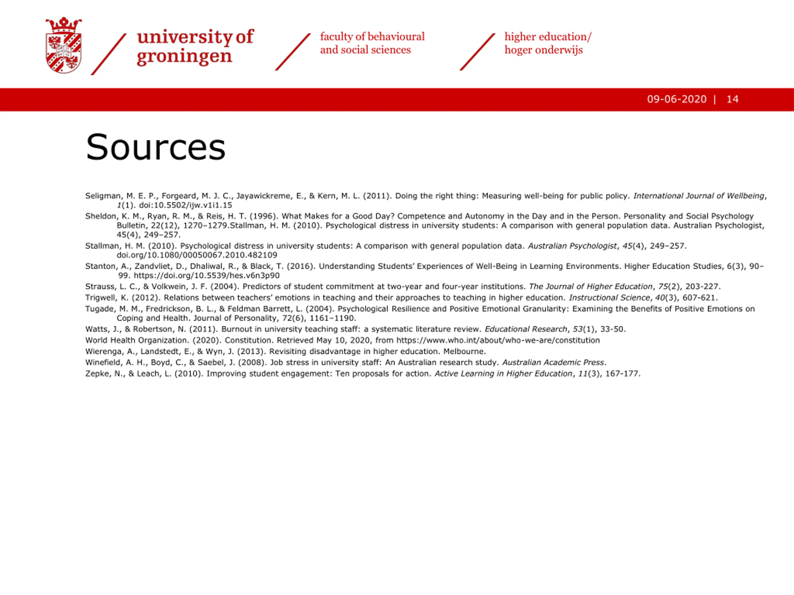 faculty of behavioural and social sciences higher education/ hoger onderwijs 09-06-2020 | 14 Sources Seligman, M. E. P., Forgeard, M. J. C., Jayawickreme, E., & Kern, M. L. (2011). Doing the right thing: Measuring well-being for public policy. International Journal of Wellbeing, 1(1). doi:10.5502/ijw.v1i1.15 Sheldon, K. M., Ryan, R. M., & Reis, H. T. (1996). What Makes for a Good Day? Competence and Autonomy in the Day and in the Person. Personality and Social Psychology Bulletin, 22(12), 1270 1279.Stallman, H. M. (2010). Psychological distress in university students: A comparison with general population data. Australian Psychologist, 45(4), 249 257. Stallman, H. M. (2010). Psychological distress in university students: A comparison with general population data. Australian Psychologist, 45(4), 249 257. doi.org/10.1080/00050067.2010.482109 Stanton, A., Zandvliet, D., Dhaliwal, R., & Black, T. (2016). Understanding Students Experiences of Well-Being in Learning Environments. Higher Education Studies, 6(3), 90 99. https://doi.org/10.5539/hes.v6n3p90 Strauss, L. C., & Volkwein, J. F. (2004). Predictors of student commitment at two-year and four-year institutions. The Journal of Higher Education, 75(2), 203-227. Trigwell, K. (2012). Relations between teachers emotions in teaching and their approaches to teaching in higher education. Instructional Science, 40(3), 607-621. Tugade, M. M., Fredrickson, B. L., & Feldman Barrett, L. (2004). Psychological Resilience and Positive Emotional Granularity: Examining the Benefits of Positive Emotions on Coping and Health. Journal of Personality, 72(6), 1161 1190. Watts, J., & Robertson, N. (2011). Burnout in university teaching staff: a systematic literature review. Educational Research, 53(1), 33-50. World Health Organization. (2020). Constitution. Retrieved May 10, 2020, from https://www.who.int/about/who-we-are/constitution Wierenga, A., Landstedt, E., & Wyn, J. (2013). Revisiting disadvantage in higher education. Melbourne. Winefield, A. H., Boyd, C., & Saebel, J. (2008). Job stress in university staff: An Australian research study. Australian Academic Press. Zepke, N., & Leach, L. (2010). Improving student engagement: Ten proposals for action. Active Learning in Higher Education, 11(3), 167-177.