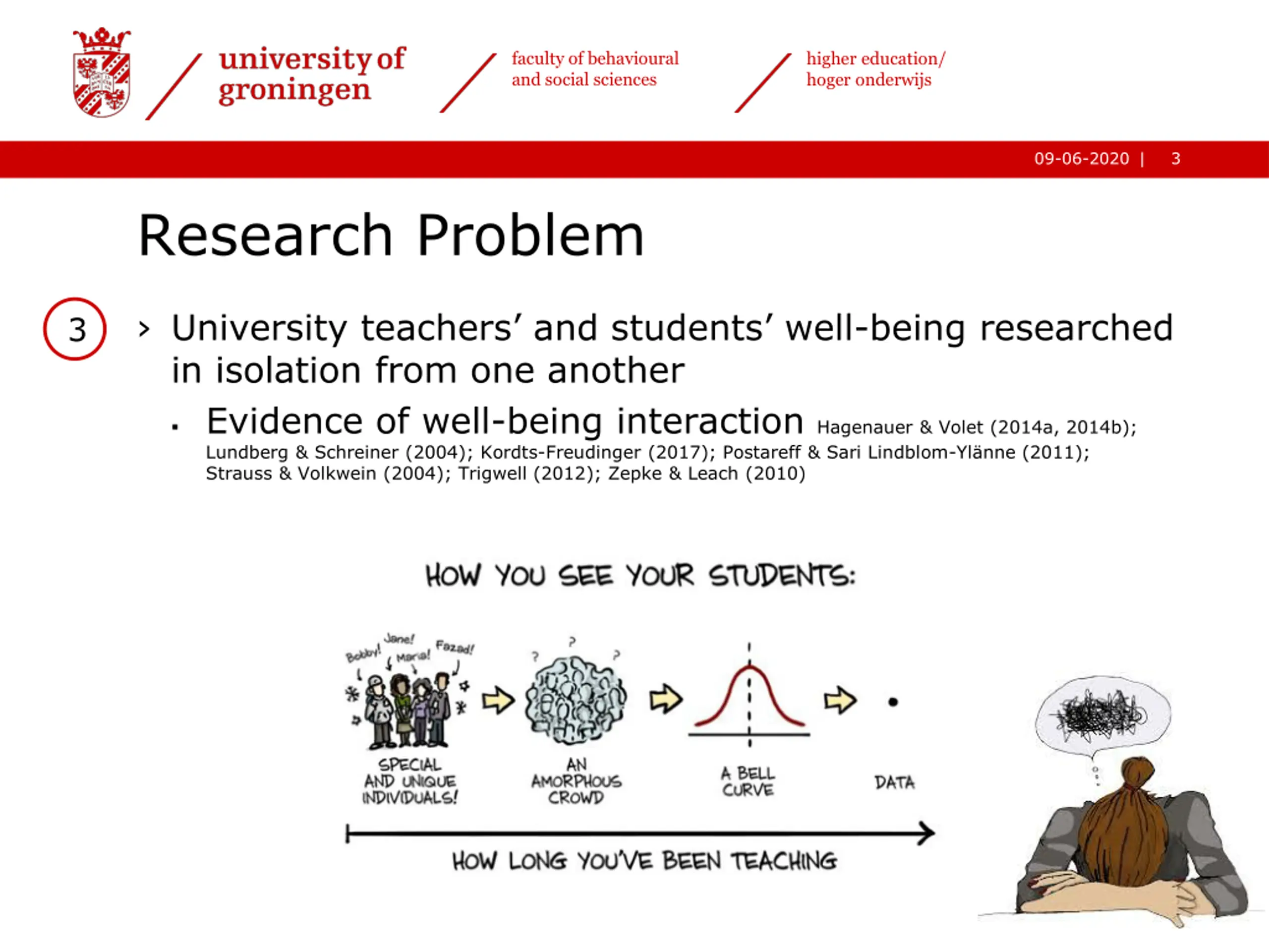 faculty of behavioural and social sciences higher education/ hoger onderwijs 09-06-2020 | 3 Research Problem University teachers and students well-being researched in isolation from one another Evidence of well-being interaction Hagenauer & Volet (2014a, 2014b); Lundberg & Schreiner (2004); Kordts-Freudinger (2017); Postareff & Sari Lindblom-Yl nne (2011); Strauss & Volkwein (2004); Trigwell (2012); Zepke & Leach (2010) 3