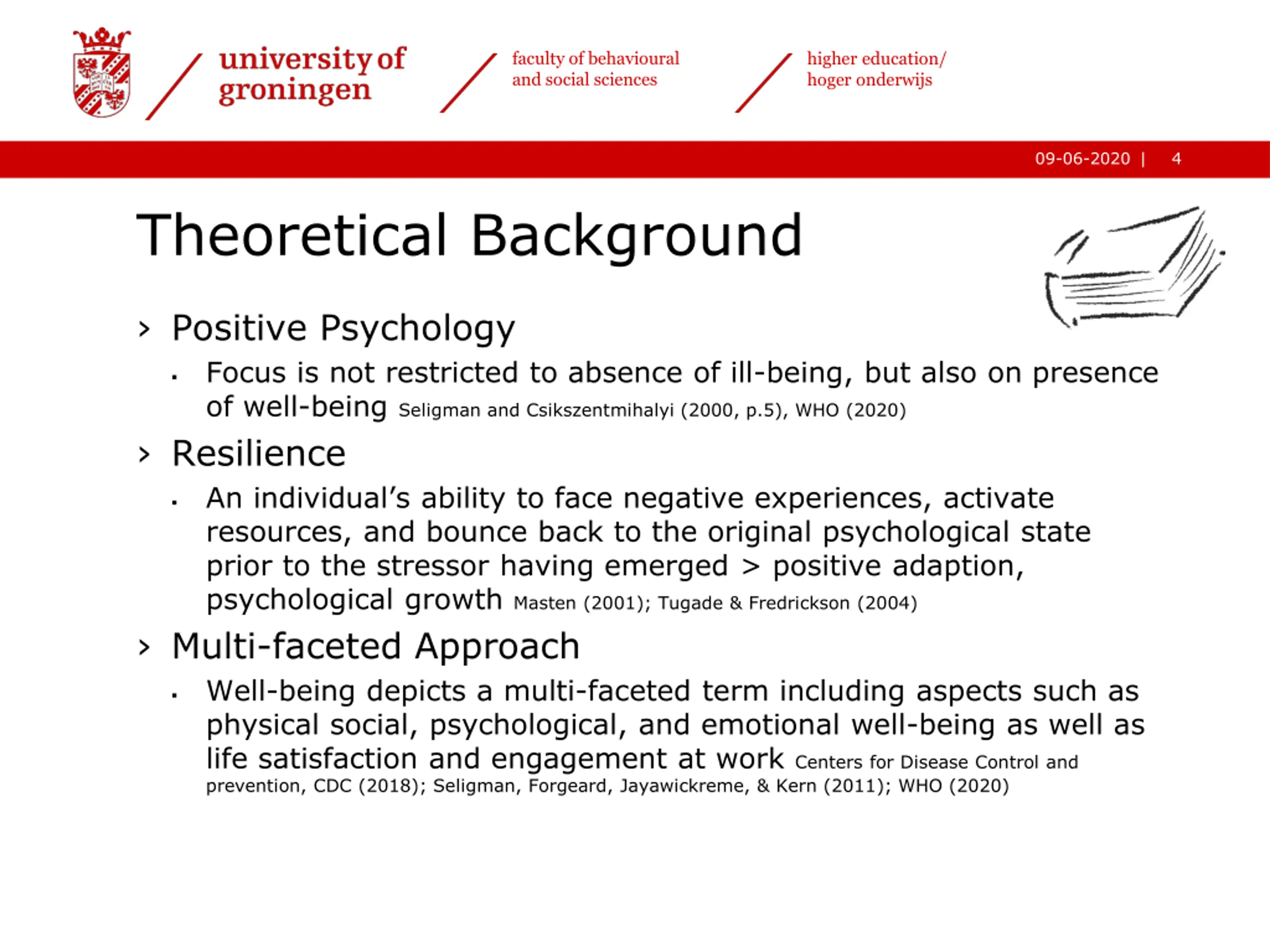 faculty of behavioural and social sciences higher education/ hoger onderwijs 09-06-2020 | 4 Theoretical Background Positive Psychology Focus is not restricted to absence of ill-being, but also on presence of well-being Seligman and Csikszentmihalyi (2000, p.5), WHO (2020) Resilience An individual s ability to face negative experiences, activate resources, and bounce back to the original psychological state prior to the stressor having emerged > positive adaption, psychological growth Masten (2001); Tugade & Fredrickson (2004) Multi-faceted Approach Well-being depicts a multi-faceted term including aspects such as physical social, psychological, and emotional well-being as well as life satisfaction and engagement at work Centers for Disease Control and prevention, CDC (2018); Seligman, Forgeard, Jayawickreme, & Kern (2011); WHO (2020)