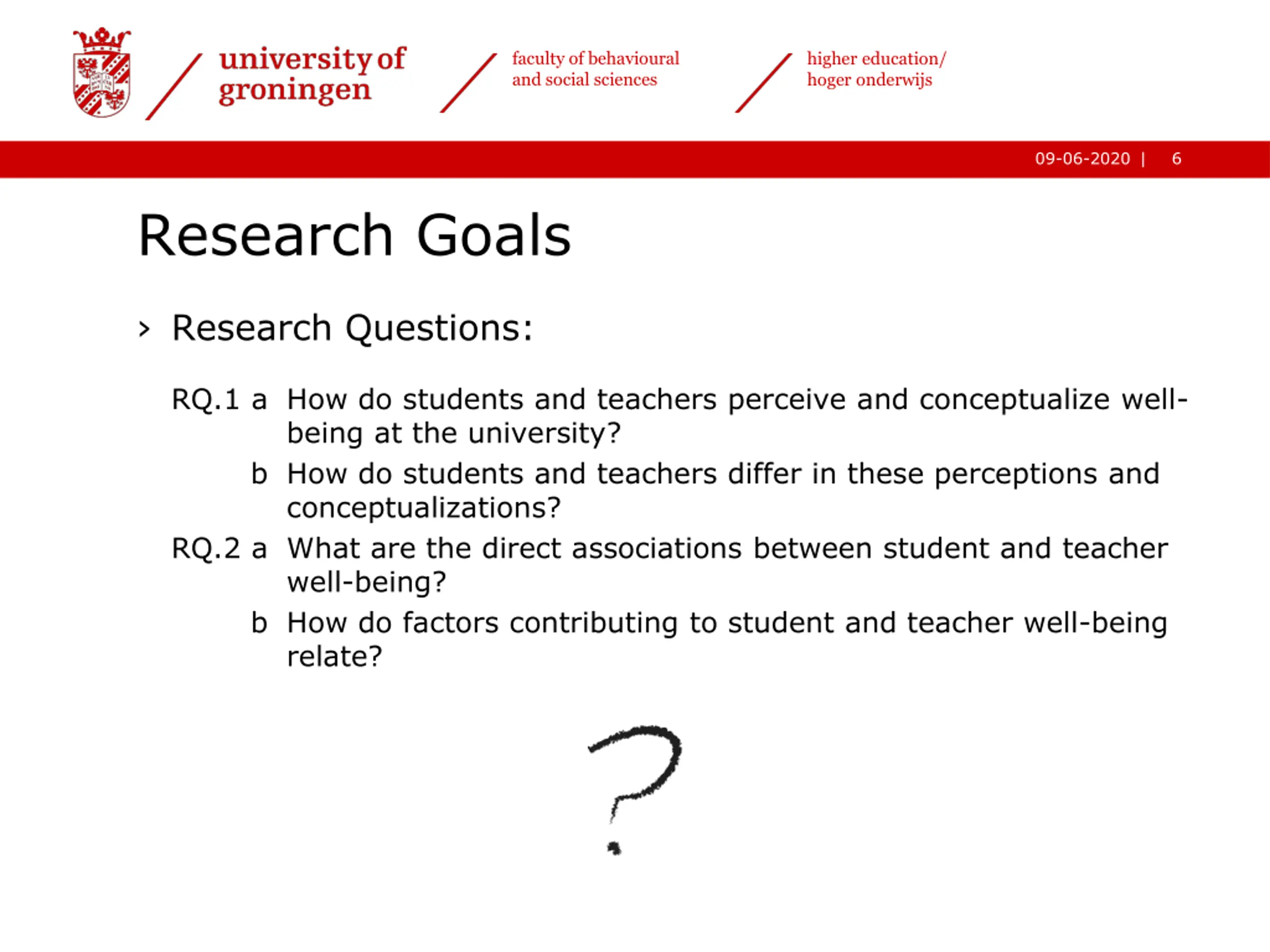 faculty of behavioural and social sciences higher education/ hoger onderwijs 09-06-2020 | 6 Research Goals Research Questions: RQ.1 a How do students and teachers perceive and conceptualize well- being at the university? b How do students and teachers differ in these perceptions and conceptualizations? RQ.2 a What are the direct associations between student and teacher well-being? b How do factors contributing to student and teacher well-being relate?