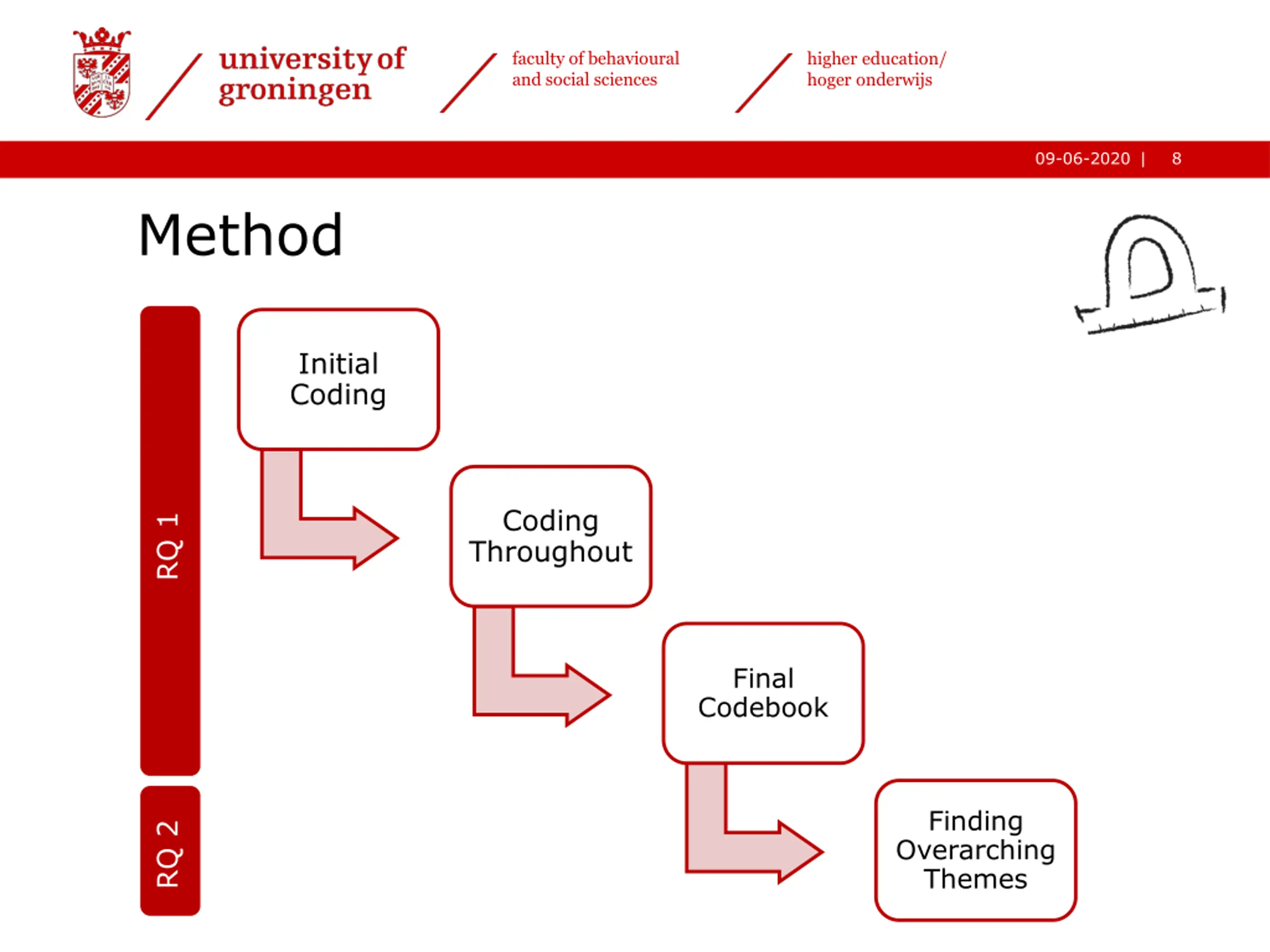faculty of behavioural and social sciences higher education/ hoger onderwijs 09-06-2020 | 8 Method Initial Coding Coding Throughout RQ 1 Final Codebook Finding Overarching Themes RQ 2