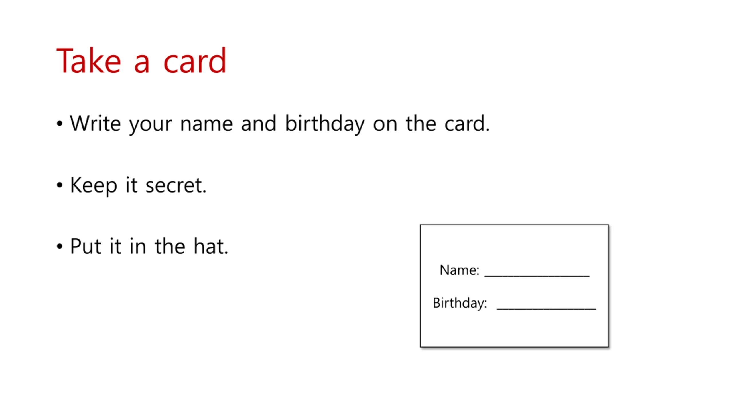 Take a card Write your name and birthday on the card. Keep it secret. Put it in the hat. Name: __________________ Birthday: _________________