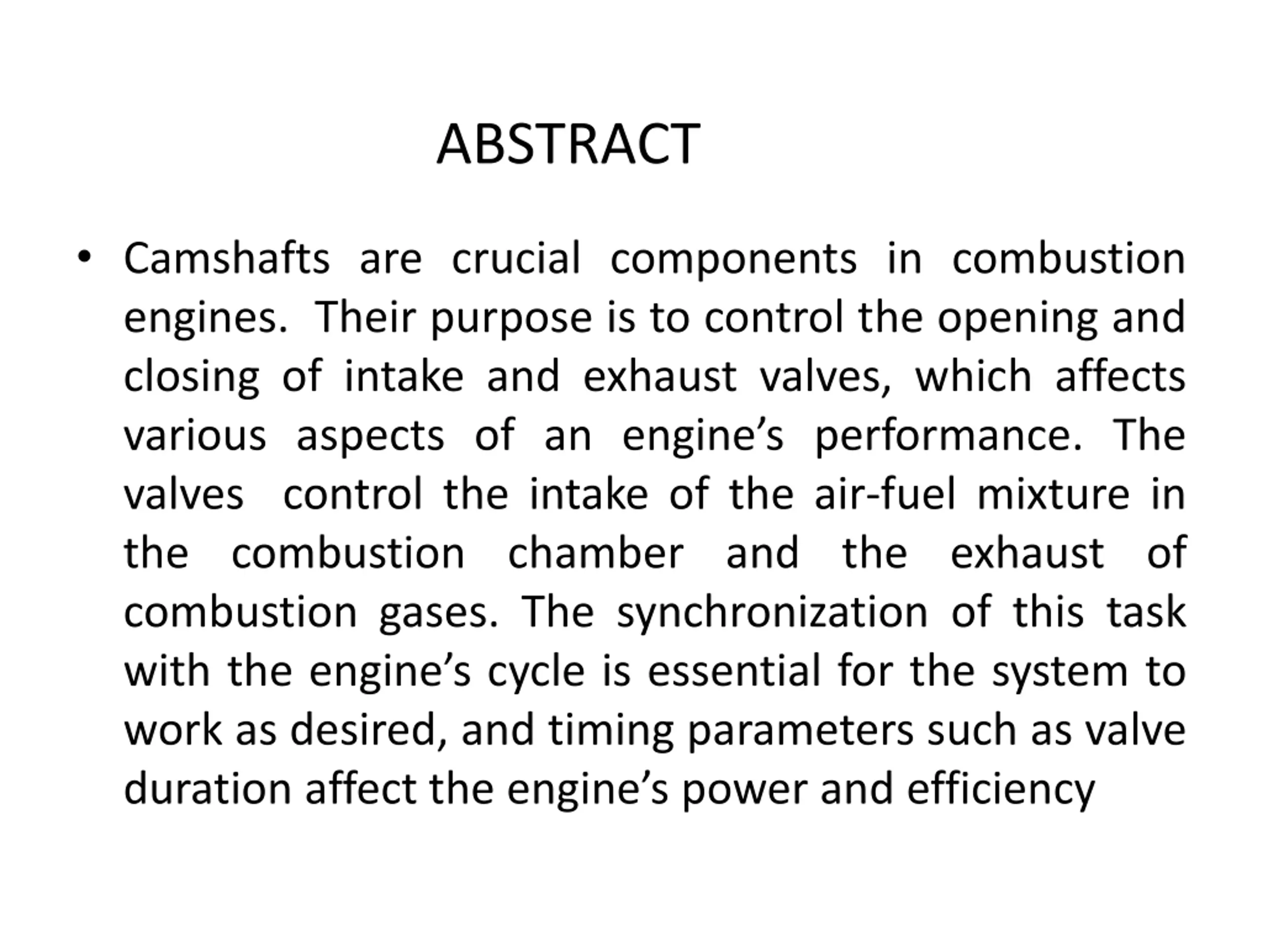 ABSTRACT Camshafts are crucial components in combustion engines. Their purpose is to control the opening and closing of intake and exhaust valves, which affects various aspects of an engine s performance. The valves control the intake of the air-fuel mixture in the combustion chamber and the exhaust of combustion gases. The synchronization of this task with the engine s cycle is essential for the system to work as desired, and timing parameters such as valve duration affect the engine s power and efficiency