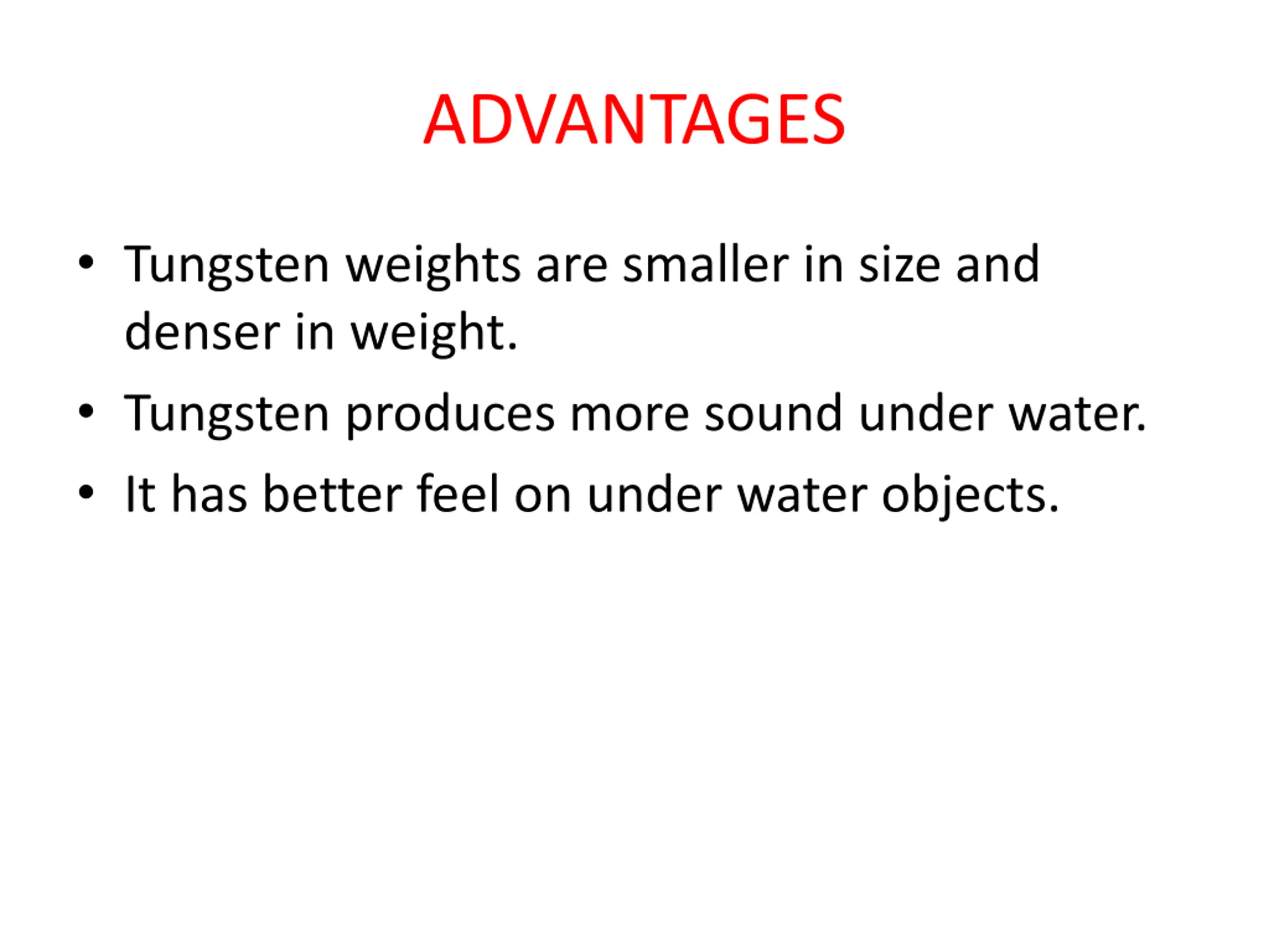 ADVANTAGES Tungsten weights are smaller in size and denser in weight. Tungsten produces more sound under water. It has better feel on under water objects.
