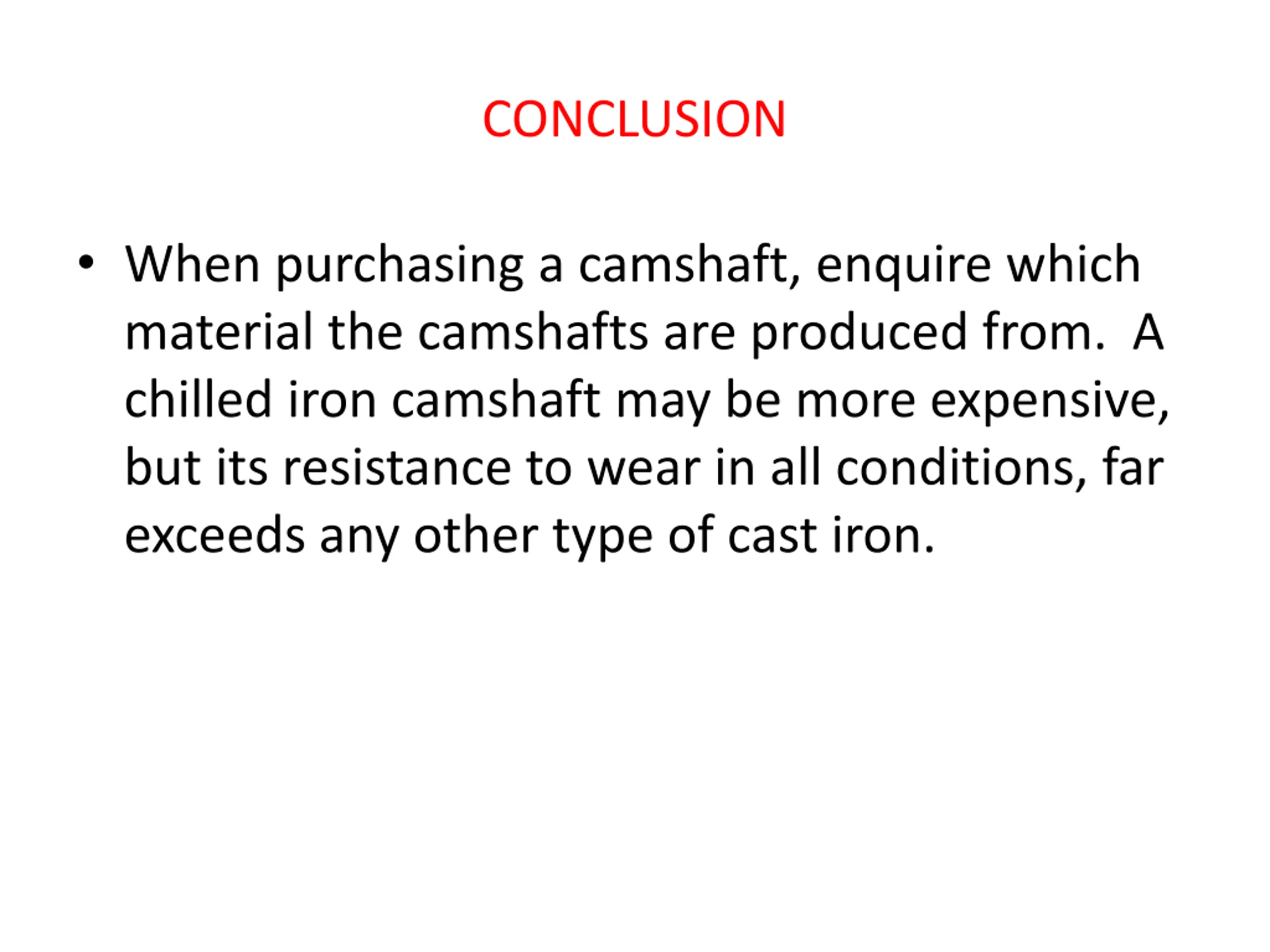 CONCLUSION When purchasing a camshaft, enquire which material the camshafts are produced from. A chilled iron camshaft may be more expensive, but its resistance to wear in all conditions, far exceeds any other type of cast iron.