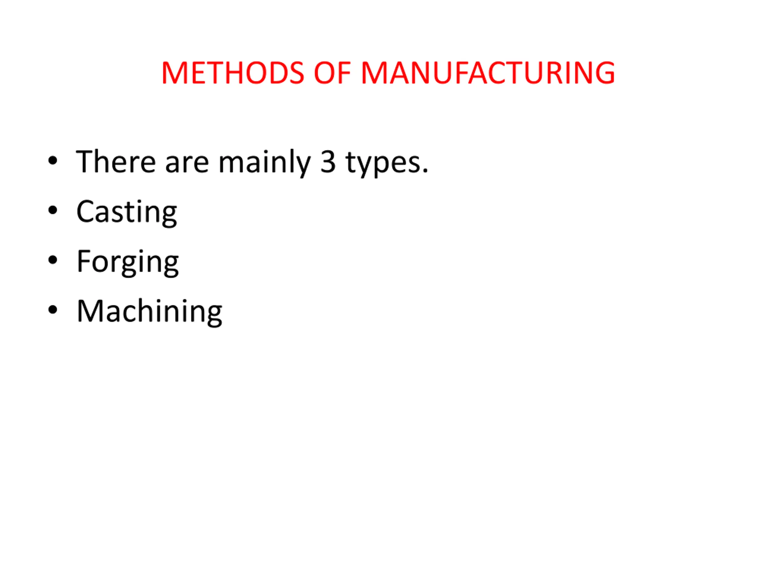 METHODS OF MANUFACTURING There are mainly 3 types. Casting Forging Machining