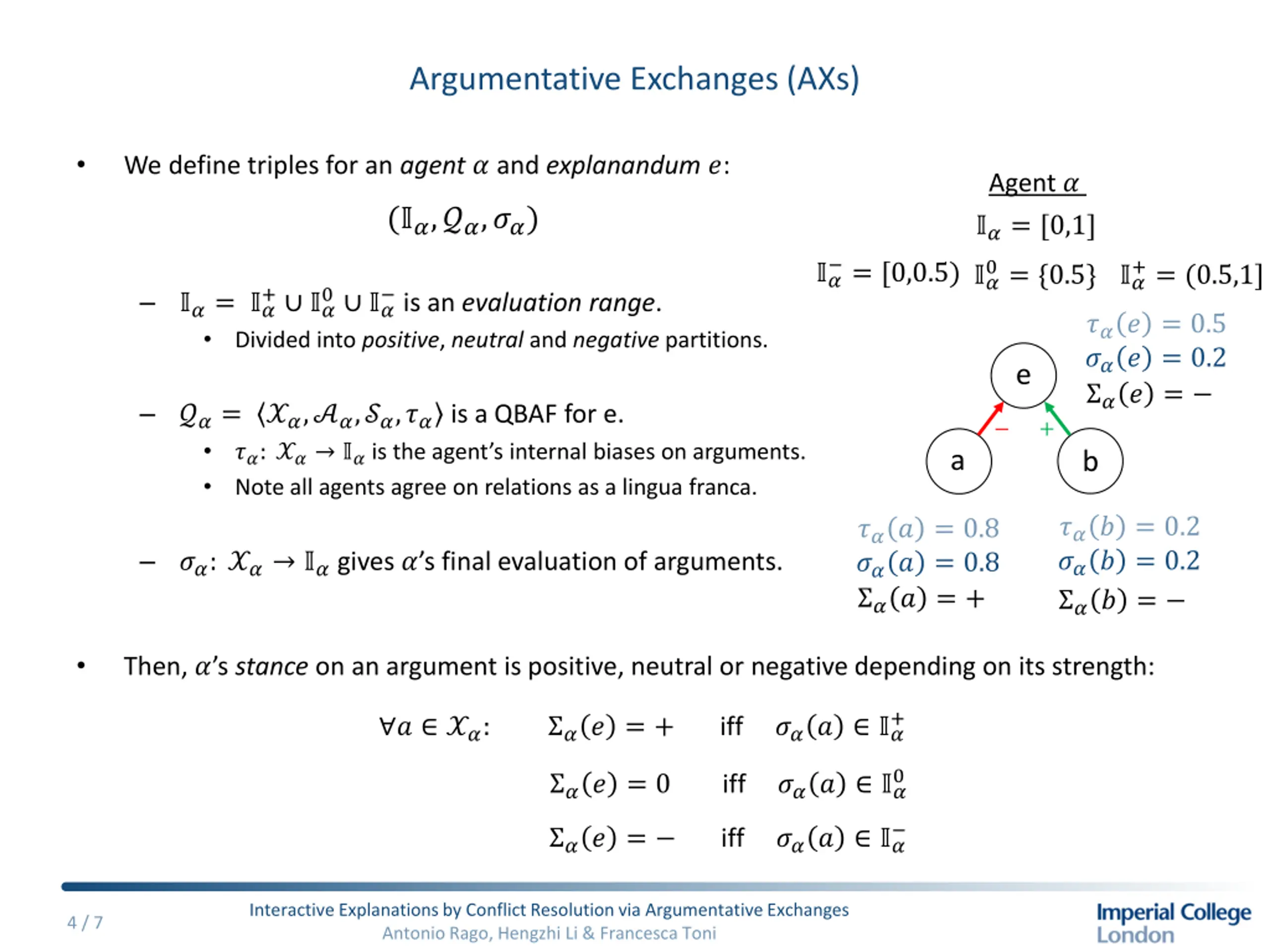Argumentative Exchanges (AXs) We define triples for an agent ? and explanandum ?: Agent ? ??= [0,1] (??,??,??) = [0,0.5) 0= {0.5} += (0.5,1] ?? ?? ?? + ?? Divided into positive, neutral and negative partitions. 0 ?? is an evaluation range. ??= ?? ??? = 0.5 ??? = 0.2 ?? = e ??= ??,??,??,?? is a QBAF for e. ??: ?? ??is the agent s internal biases on arguments. Note all agents agree on relations as a lingua franca. + a b ??? = 0.2 ??? = 0.2 ?? = ??? = 0.8 ??? = 0.8 ?? = + ??: ?? ??gives ? s final evaluation of arguments. Then, ? s stance on an argument is positive, neutral or negative depending on its strength: + ? ??: ?? = + iff ??? ?? 0 ?? = 0 iff ??? ?? ?? = iff ??? ?? Interactive Explanations by Conflict Resolution via Argumentative Exchanges Antonio Rago, Hengzhi Li & Francesca Toni 4 / 7