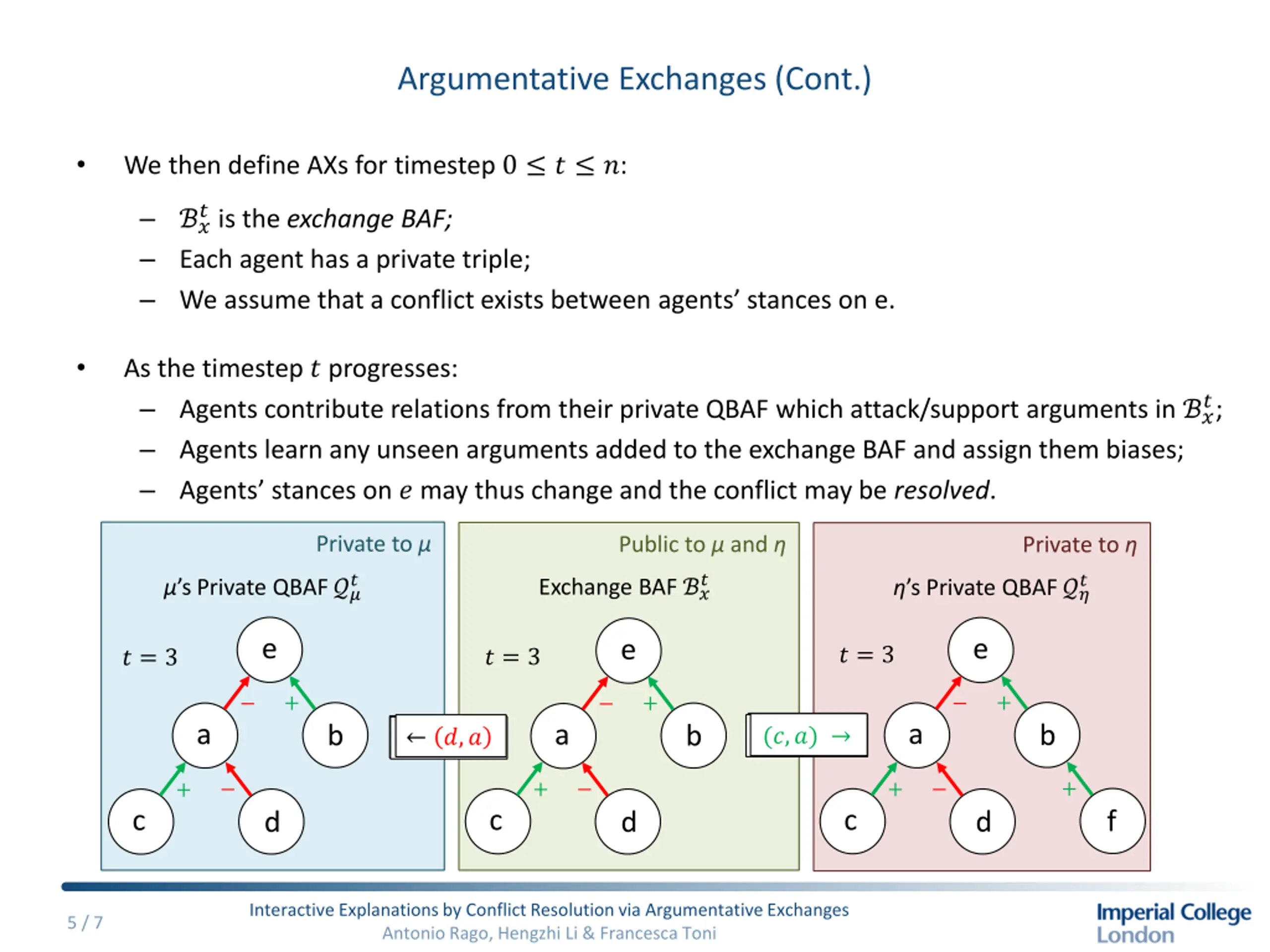 Argumentative Exchanges (Cont.) We then define AXs for timestep 0 ? ?: ? is the exchange BAF; ? Each agent has a private triple; We assume that a conflict exists between agents stances on e. As the timestep ? progresses: Agents contribute relations from their private QBAF which attack/support arguments in ? Agents learn any unseen arguments added to the exchange BAF and assign them biases; Agents stances on ? may thus change and the conflict may be resolved. ?; Private to Public to and Private to ? ? ? Exchange BAF ? s Private QBAF ?? s Private QBAF ?? e e e ? = 0 ? = 1 ? = 2 ? = 3 ? = 0 ? = 1 ? = 2 ? = 3 ? = 0 ? = 1 ? = 2 ? = 3 + + + a a a b b b (?,?) ?,? (?,?) (?,?) (?,?) ?,? + + + + c c c f d d d Interactive Explanations by Conflict Resolution via Argumentative Exchanges Antonio Rago, Hengzhi Li & Francesca Toni 5 / 7