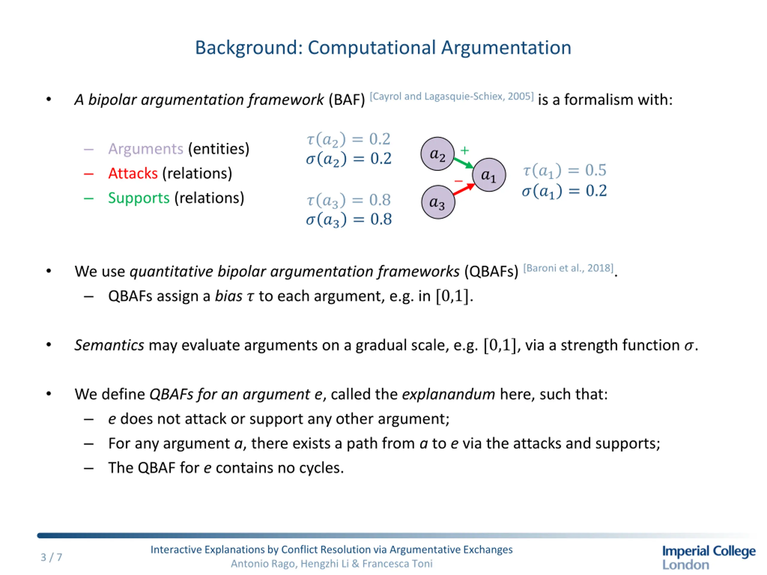 Background: Computational Argumentation A bipolar argumentation framework (BAF) [Cayrol and Lagasquie-Schiex, 2005] is a formalism with: ? ?2 = 0.2 ? ?2 = 0.2 Arguments (entities) Attacks (relations) Supports (relations) + ?2 ? ?1 = 0.5 ? ?1 = 0.2 ?1 ? ?3 = 0.8 ? ?3 = 0.8 ?3 We use quantitative bipolar argumentation frameworks (QBAFs) [Baroni et al., 2018]. QBAFs assign a bias? to each argument, e.g. in [0,1]. Semantics may evaluate arguments on a gradual scale, e.g. [0,1], via a strength function ?. We define QBAFs for an argument e, called the explanandum here,such that: e does not attack or support any other argument; For any argument a, there exists a path from a to e via the attacks and supports; The QBAF for e contains no cycles. Interactive Explanations by Conflict Resolution via Argumentative Exchanges Antonio Rago, Hengzhi Li & Francesca Toni 3 / 7