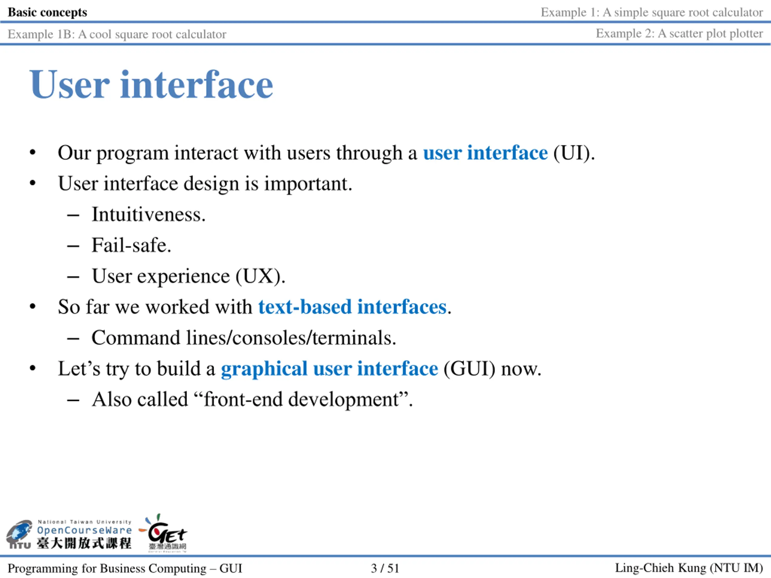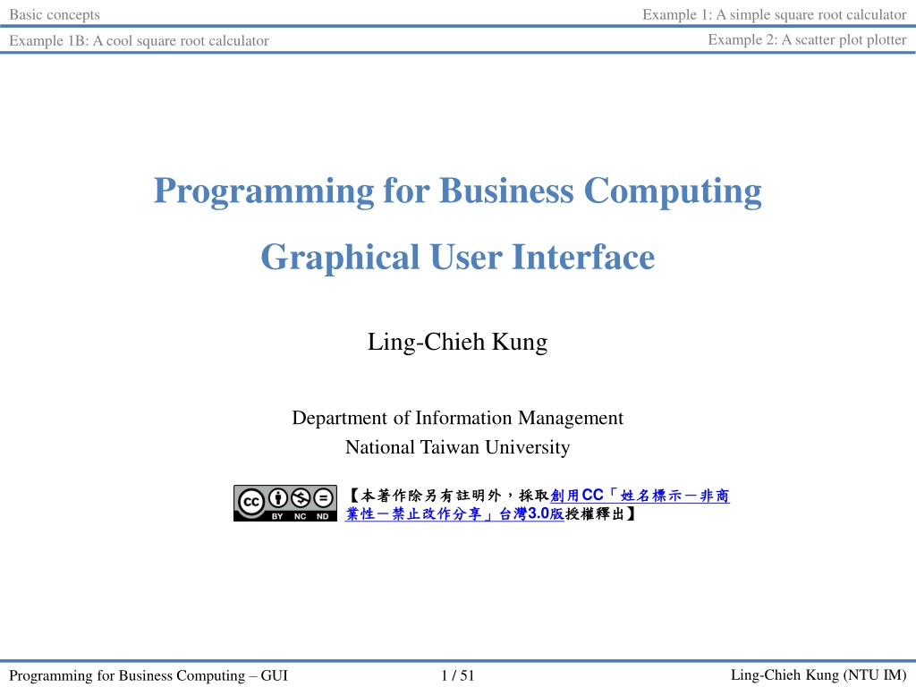 Basic concepts Example 1: A simple square root calculator Example 2: A scatter plot plotter Example 1B: A cool square root calculator Programming for Business Computing Graphical User Interface Ling-Chieh Kung Department of Information Management National Taiwan University CC 3.0 Ling-Chieh Kung (NTU IM) Programming for Business Computing GUI 1 / 51