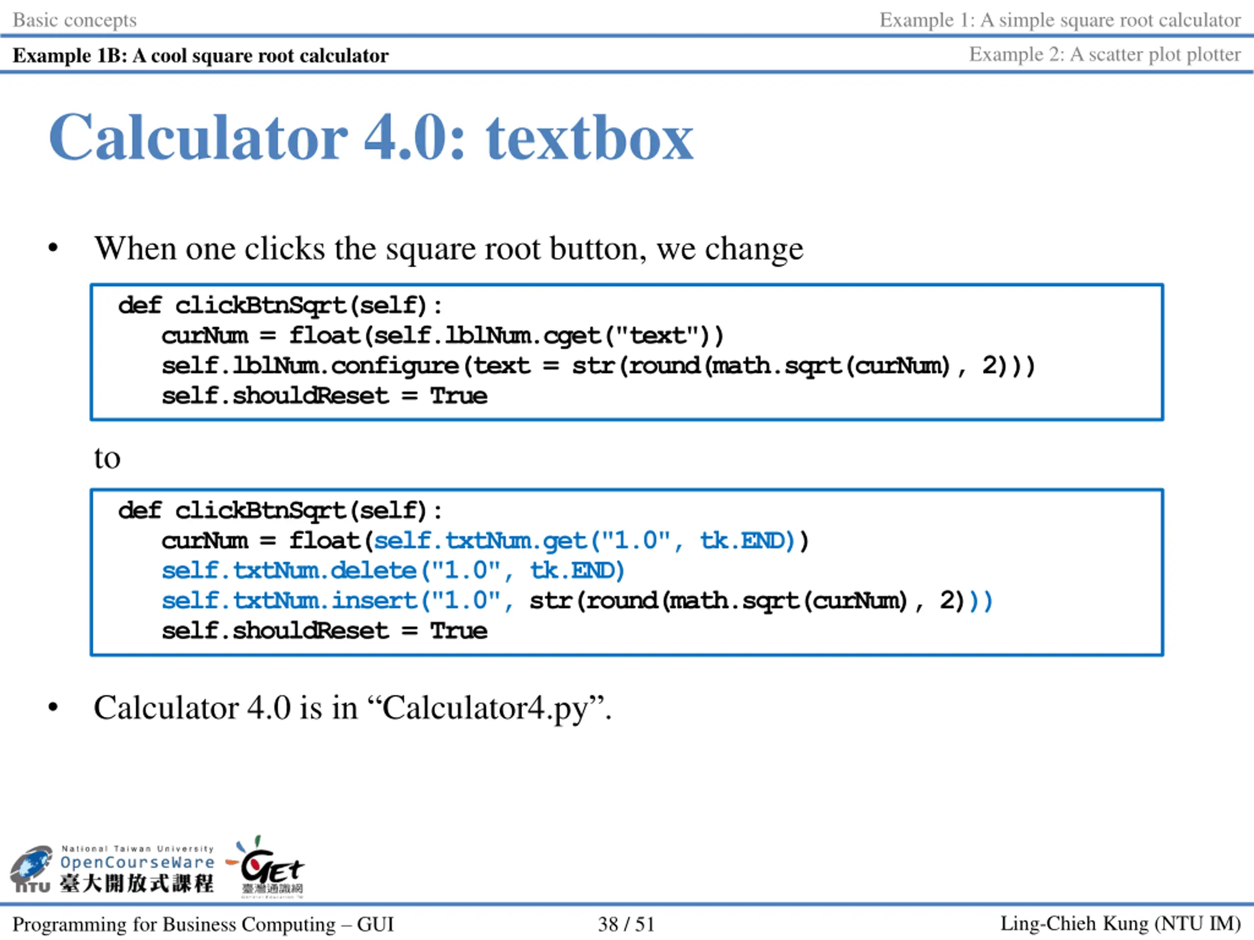 Basic concepts Example 1: A simple square root calculator Example 2: A scatter plot plotter Example 1B: A cool square root calculator Calculator 4.0: textbox Let s allow a user to type in numbers. Ling-Chieh Kung (NTU IM) Programming for Business Computing GUI 35 / 51