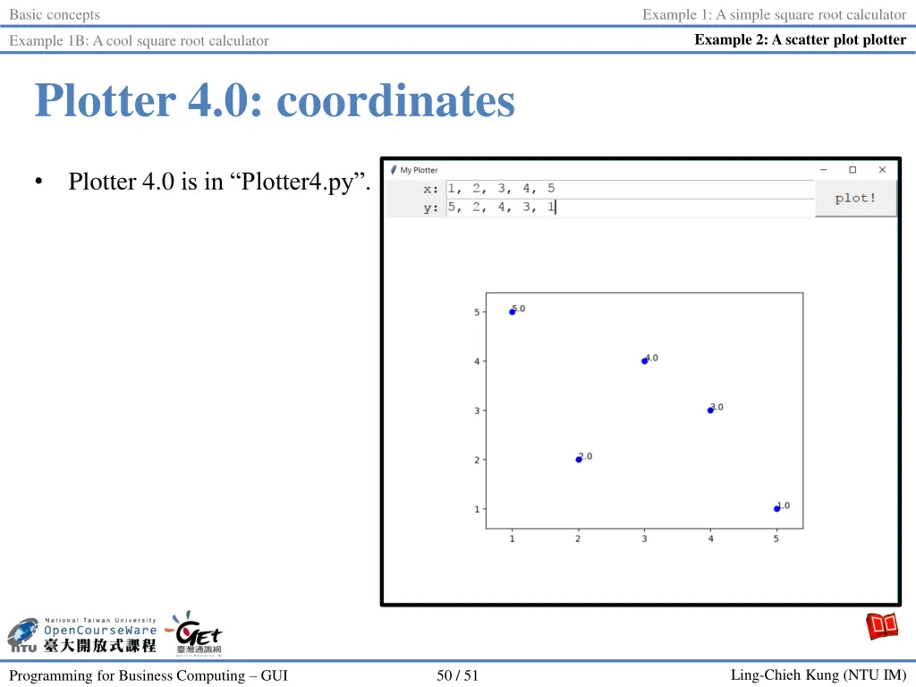 Basic concepts Example 1: A simple square root calculator Example 2: A scatter plot plotter Example 1B: A cool square root calculator Plotter 4.0: coordinates Plotter 4.0 is in Plotter4.py . Ling-Chieh Kung (NTU IM) Programming for Business Computing GUI 50 / 51