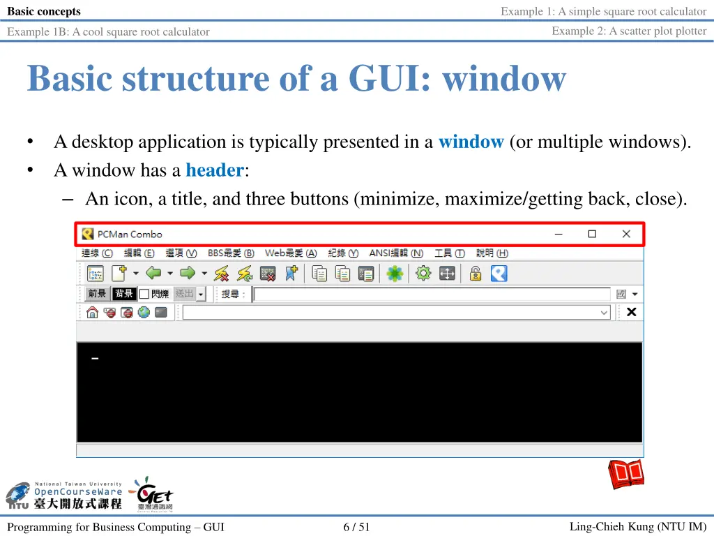 Basic concepts Example 1: A simple square root calculator Example 2: A scatter plot plotter Example 1B: A cool square root calculator Basic structure of a GUI: window A desktop application is typically presented in a window (or multiple windows). A window has a header: An icon, a title, and three buttons (minimize, maximize/getting back, close). Ling-Chieh Kung (NTU IM) Programming for Business Computing GUI 6 / 51