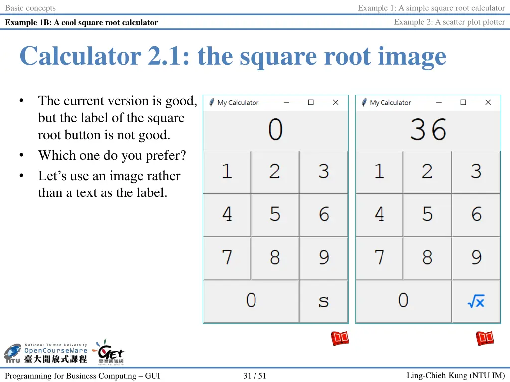 Basic concepts Example 1: A simple square root calculator Example 2: A scatter plot plotter Example 1B: A cool square root calculator Calculator 2.1: the square root image The current version is good, but the label of the square root button is not good. Which one do you prefer? Let s use an image rather than a text as the label. Ling-Chieh Kung (NTU IM) Programming for Business Computing GUI 31 / 51